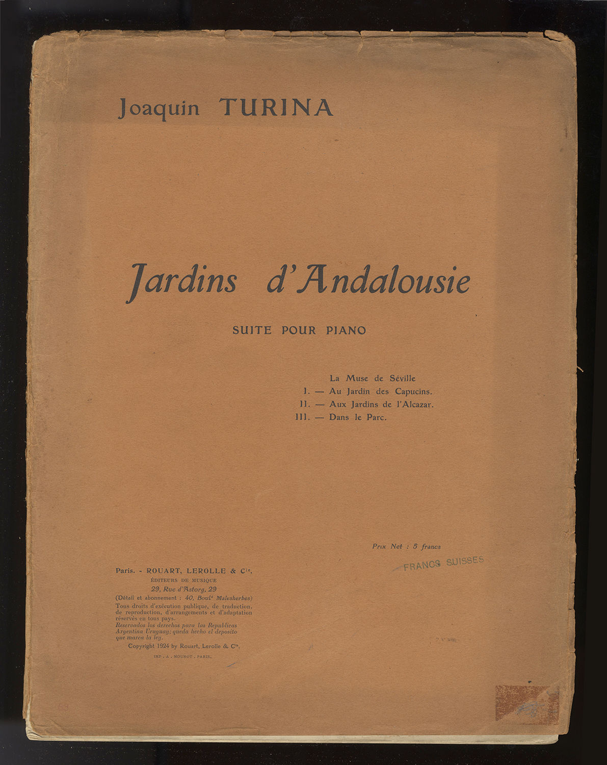 Paris: Rouart, Lerolle & Cie [R.L. PN 11516 (1)-(3) et Cie.], 1924. Folio. Original publisher's sepia wrappers with titling to upper, publisher's advertisment to verso of lower ("Oeuvres de J. Turina"). 28 pp. With "Paris, Imp. Mounot" and "Leon Grandjean Grav.") printed to foot of final page of music.