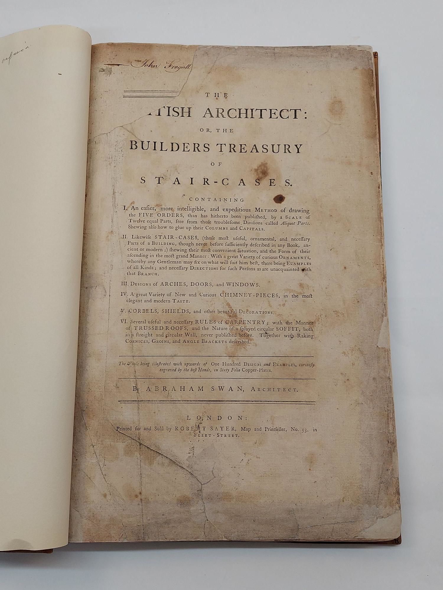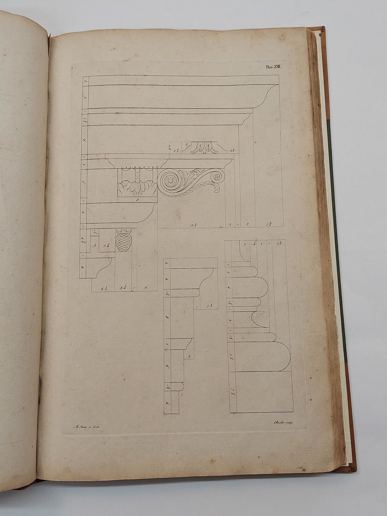 London: Robert Sayer. Hardcover. Folio, unpaginated. Half-bound in green-cloth and leather. Rebound. Mild rubbing and abrasions to leather; small area of cloth has peeled up from rear board. Pencil notation to verso of front free end paper. Inscription in ink to head of Introduction. Title page has been remargined, though large portion is missing at head. Foxing, creasing and soiling throughout text. Includes numerous architectural illustrations, diagrams and floor-plans. Binding is sturdy. Good copy only. Spine is tan leather with six raised bands; gilt text in black box at head.