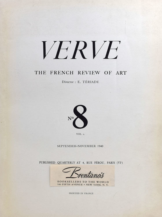 Paris: Breantano's 586 Fifth Avenue Label over French label, 1940. Double page colour lithograph at pp. 62-63 by Bonnard. folio. Wrappers by Matisse. Double page colour lithograph at pp. 62-63 by Bonnard. folio. The last issue before the Nazi occupation of Paris.