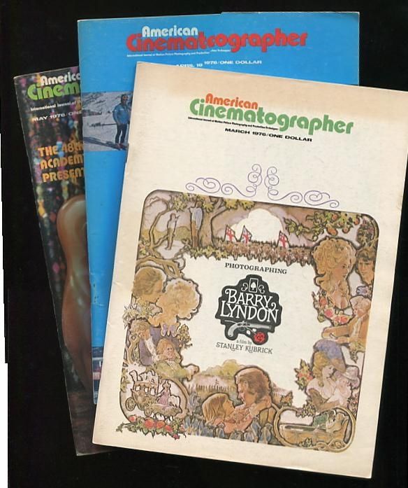Hollywood: ASC Holding Corp.. Very Good+. 1976. Magazine. [each of the three issues is in VG+ or better condition; one has a subscription address label on the rear cover, another some remnants of a removed label]. A three-part series on the early history of Hollywood studios by one of its most erstwhile chroniclers, featuring dozens of rare photos of studio plants and personnel. Each article is briefly INSCRIBED and SIGNED by the author on its first page, and one of the articles includes a few emendations and corrections in the author's hand; the inscriptions are to another distinguished film historian, Rudy Behlmer, from whose estate these were acquired. The series is contained in three consecutive issues of American Cinematographer magazine, each of which of course is jam-packed with other articles and features of interest, notably: an article on the filming of Stanley Kubrick's BARRY LYNDON, and multiple articles on film production in Hungary (the March 1976 issue); numerous features on the filming of the 1976 Winter Olympics (April 1976); several articles on the filming of ALL THE PRESIDENT'S MEN, and coverage of that year's Oscar nominees and winners for cinematography (May 1976). Signed by Author .