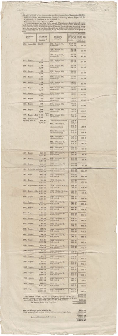 [Providence, 1838. Broadside, 27" x 9", text in 5 columns beneath the running head; neatly folded in half, a couple of creases, edges a bit frayed at top and bottom, but overall very good. Comprises a tabular list of the cost of repairs to the bridge by year, annual tolls, receipts, as well as net interest due after the tolls are deducted, covering the years 1793 to 1837. A summary at end indicates that the Proprietors are due $116,780.87. The bridge, built by the Providence South Bridge Co. organized by John Brown, spanned the Seekonk River between Providence and East Providence. The original bridge contained a wooden statue of Washington and marble tablet dedicating the bridge "as a testimony of high respect" to him. The statue was lost when the bridge was destroyed in 1815. The tablet now resides at the Rhode Island Historical Society. The sole copy located in OCLC is at the AAS which contains the following catalogue note: "The Rhode Island General Assembly appointed a committee to examine and adjust the accounts of the Proprietors of the Washington Bridge in Providence. Cf. Schedule of the Rhode Island General Assembly, Jan. 1838, p.119-20. Includes 'Extract from amendment of charter, in 1815.' The complete amendment appears in the schedule of the Rhode Island General Assembly, Oct. 1815, p. 21-22." Not in American Imprints. Not in Kress.