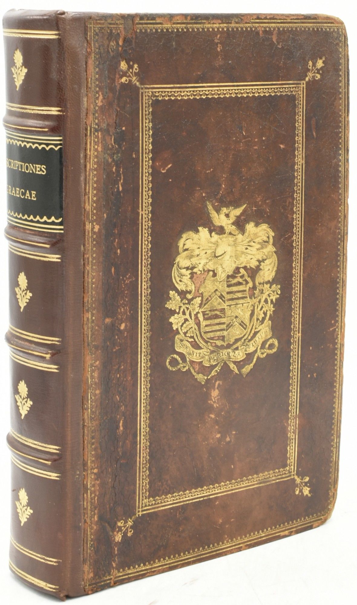 Typis ac Sumtibus Academicis excudit Johannes Smith, veneunt Londini apud J. Murray, 1825. Full Leather. Very Good binding. Full calf, neatly rebacked in new calf with raised bands and morocco label; the upper board with arms stamped in gilt: "Spernit pericula virtus", perhaps the arms of Sir James Ramsay, 8th Baronet of Bamff.~Boards are well worn, but the rebacked copy is quite sturdy and serviceable. The first blank leaf has notes about the book in Latin, and has some scotch tape repair.~~Illustrated throughout with plates, many of them folding.~~. Very Good binding.
