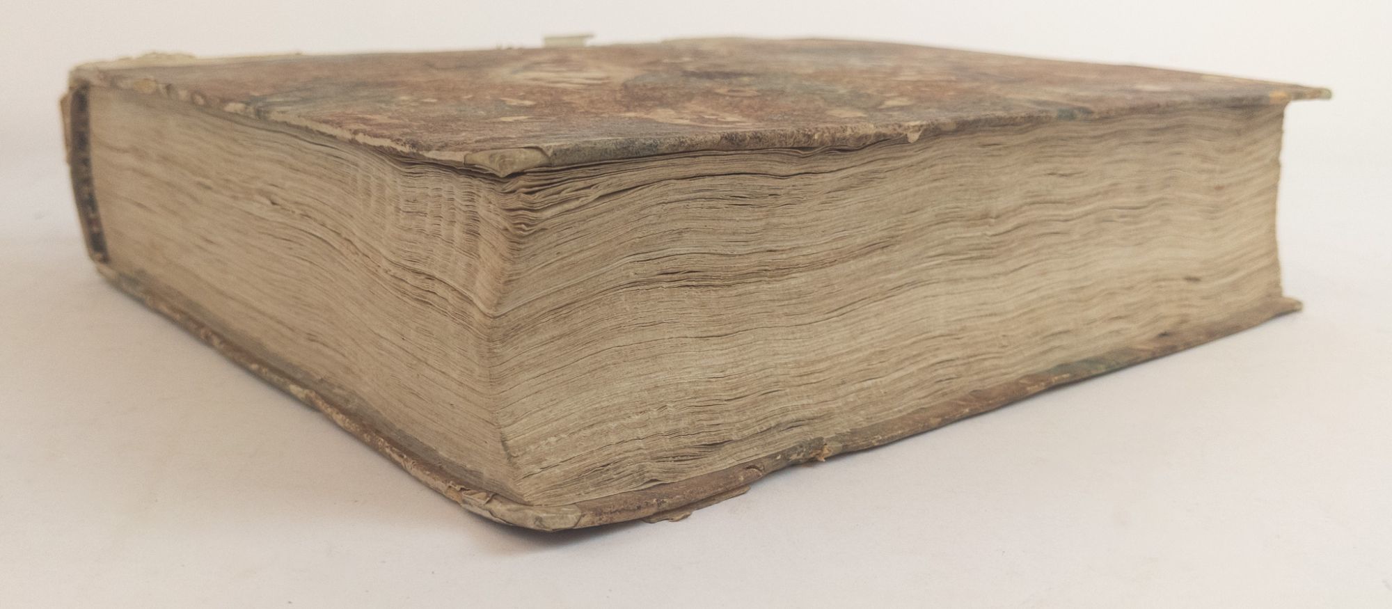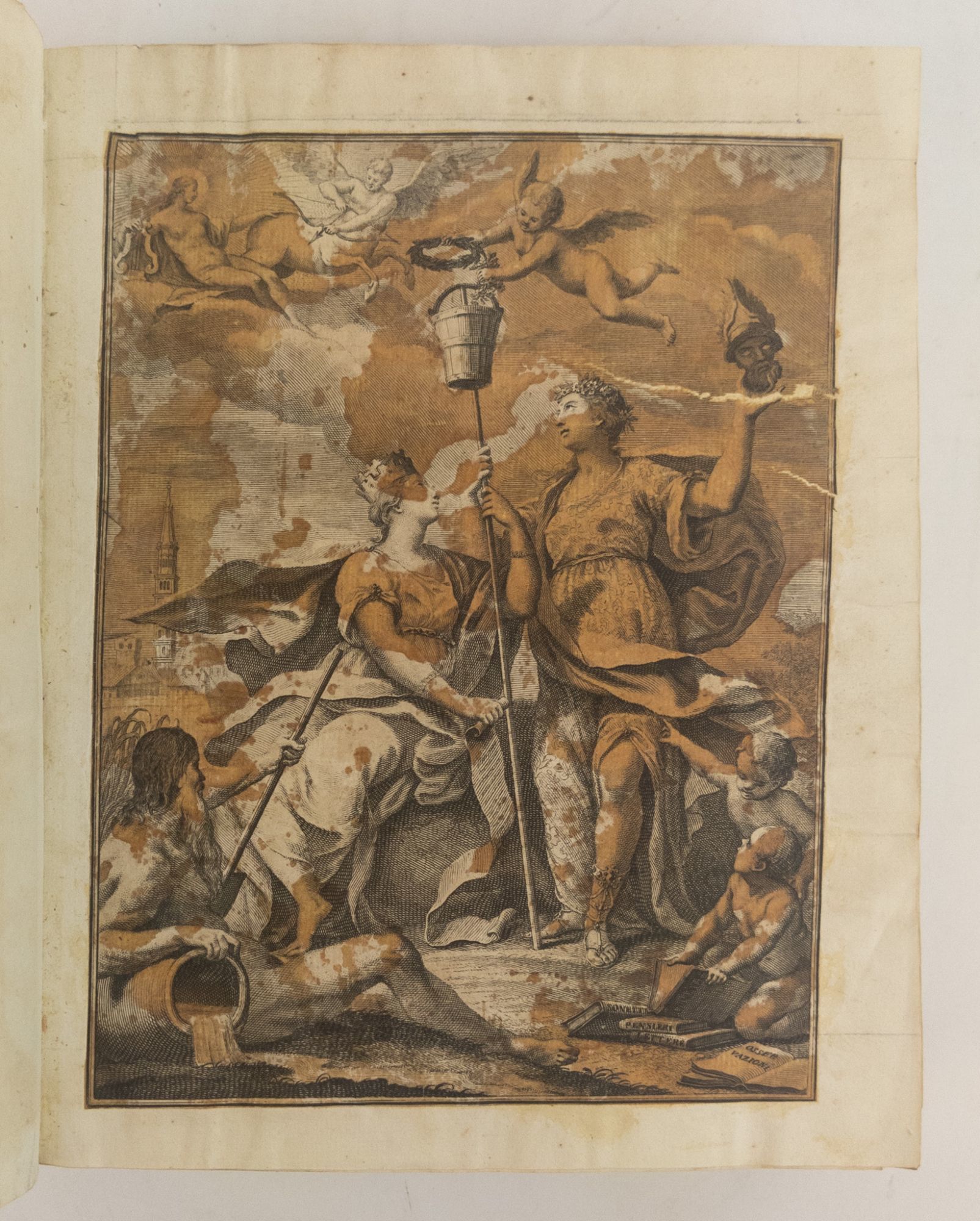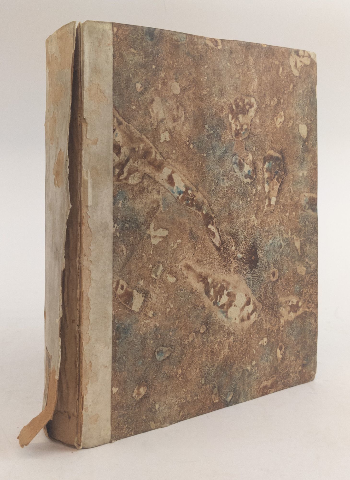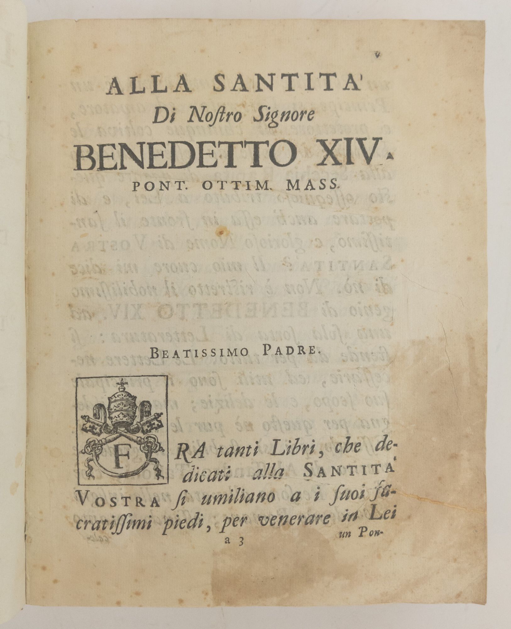 Modena: Bartolomeo Soliani Stamp, 1744. First Modena Edition. Hardcover. Large Octavo, lx, 92, 489, [1] pages. In Good minus condition. Quarter bound in vellum wtih marbled paper boards. Boards have heavy splitting to front joint, rubbing and bumping to corners, tearing to tail edge of spine, tearing to surface of spine, and stamp on spine. Textblock has non-archival repair to: xv, xli, 47, 69-75, 79, 85, 107, 141, 147, 157, 211, 271, 297, 329, 361, and 433. Chipping to fore edge of page 261 and tail edge of 283. Staining to fore edge from page 447-455.