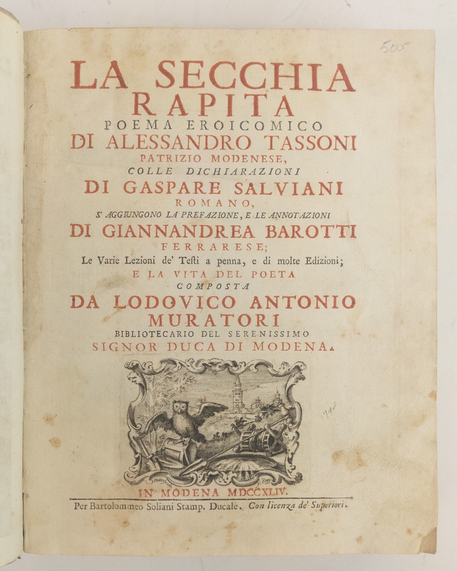 [Shelved in Room A Oversized]. Two editions were published this year, this being the first Modenese edition of the Secchia Rapita, considered the best in terms of content and typography.;