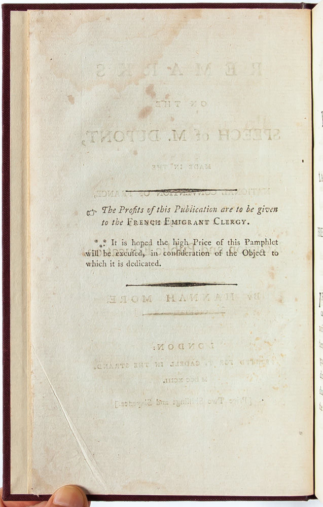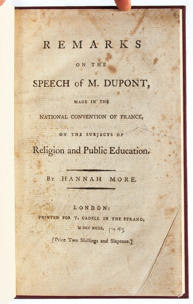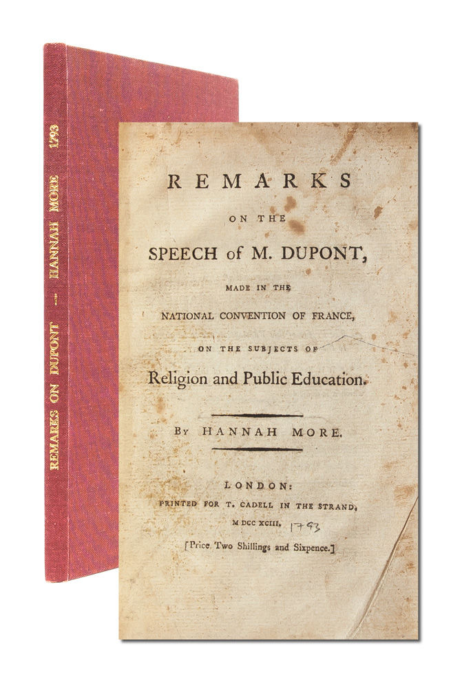 Across her involvement in abolition, women's education, and integration movements, Hannah More adeptly learned to use chapbooks and cheaply distributed publications like the present work to disseminate ideas. "As an independent woman writer, much of her work was directed to the female sex, but her desire to see women play a more constructive role in society came into conflict with her own fear of certain revolutionary ideas. Consciously aware of the techniques of propaganda that she saw being used in radical literature...[she sought] to alert British women to the serious social and political dangers inherent in those forms of radical propaganda" (Hole). Such tension shaped her Considerations on Religion and Public Education, which was directed in its first appearance "to the Ladies &c of Great Britain and Ireland" (she would revise the work to include American women, in the more common 1794 Boston edition). "More's opposition to the threat she believed the ideas of the Enlightenment and the French Revolution posed led her to popular propaganda that was directed first to the poor, then to women of the rising middle class. Her urgent campaign against the way women were represented in literature during this time led her both to her most sucessful and vigorous polemic" (Hole). Of the present work, Professor Claudia Johnson notes "On Religion and Public Education is straight propaganda: it is not contrived in a bluffy vernacular dialogue form for working class audiences but speaks directly to an elite readership with an unmediated critique" of ideas about the separation of religion from education and the rise of secularism. Arguing against Dupont's remarks at the National Convention of France, More encourages her female readers to hold fast to ideas and practices related to religious morality, including sacrifice and humility. And she exhorts her readers to remember the English beliefs about God's relationship to sovereigns, discouraging the impiety of overthrowing such leadership. Near Fine.