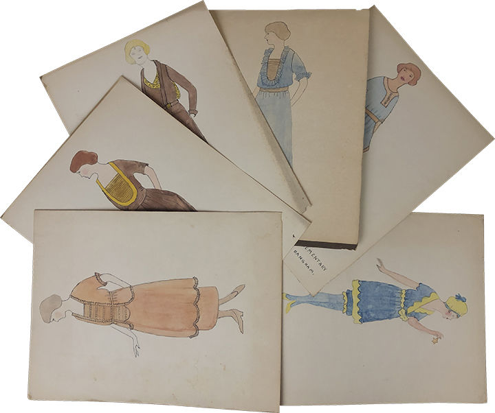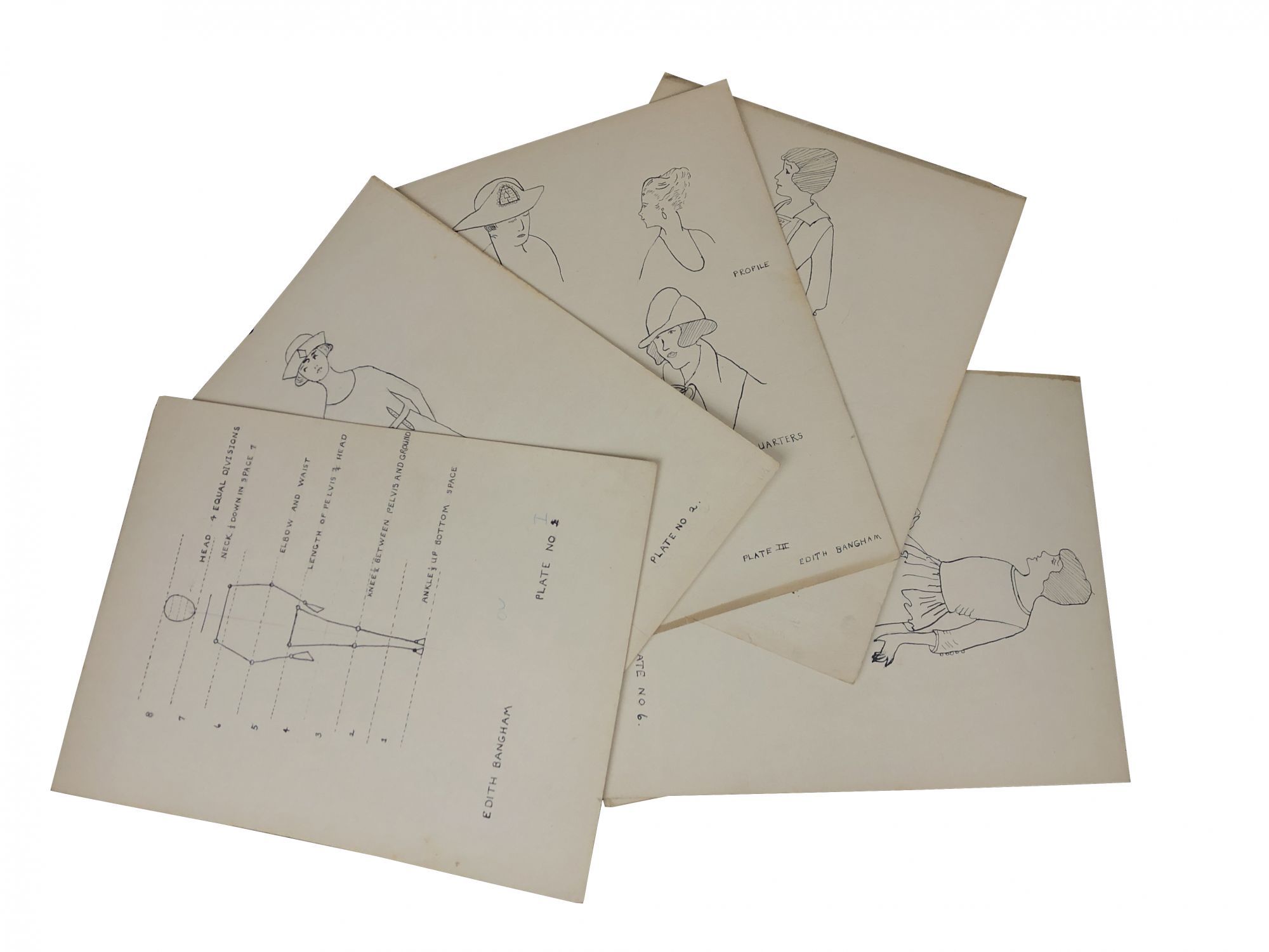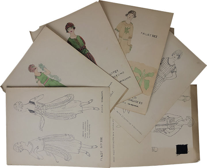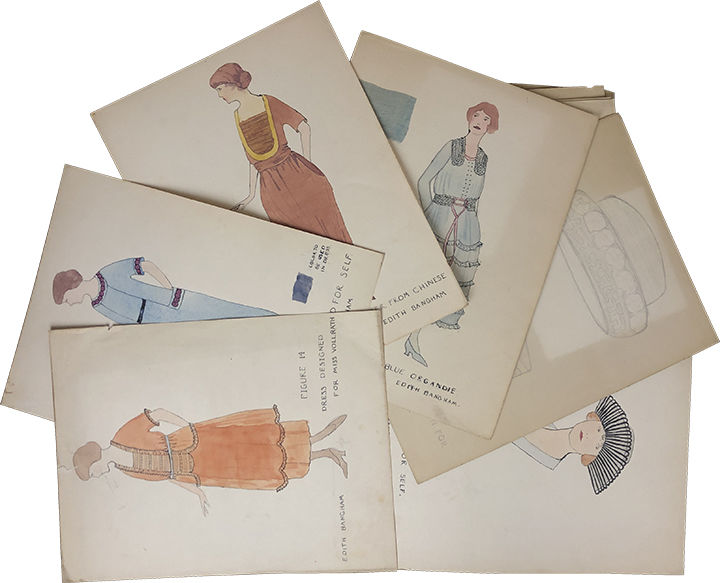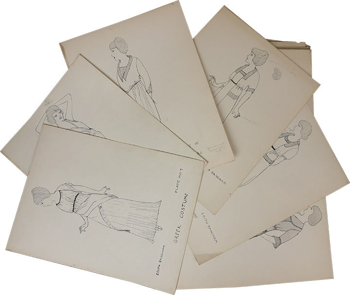 [Columbus], [n.d.]. Unbound. Good. A collection of early 20th-century fashion drawings from Edith Bangham of Madison, Wisconsin. Plates 1-4, 6-7, 9-17, 19-25 with 10 unnumbered plates, two of fabric. 32 plates total: 18 black-and-white, 14 in color. Seemingly the work of a fashion class with plates titled "Dress Adapted to Stout Figure" (with pencil notation "you do not print very well"), "Dress on Normal Figure" (with pencil notations "use more definite strokes" and "hands poor"), "Dress Adapted to Slender Figure" (with pencil notations "mouth too thin + sharp" and "hands poor"). Among the more interesting plates are "Bathing Costume Designed for Self," "Gypsy Costume" and the two untitled works on fabric that have strong vibes of Boris Artzybasheff. According to her death notice, Bangham lived from 1897 to 1986. She studied Home Economics at Ohio State University and graduated in 1920, possibly around the time she compiled this portfolio of fashion drawings. She eventually completed a master's degree at OSU and went on to teach at UW-Madison for 24 years until she retired in 1962.