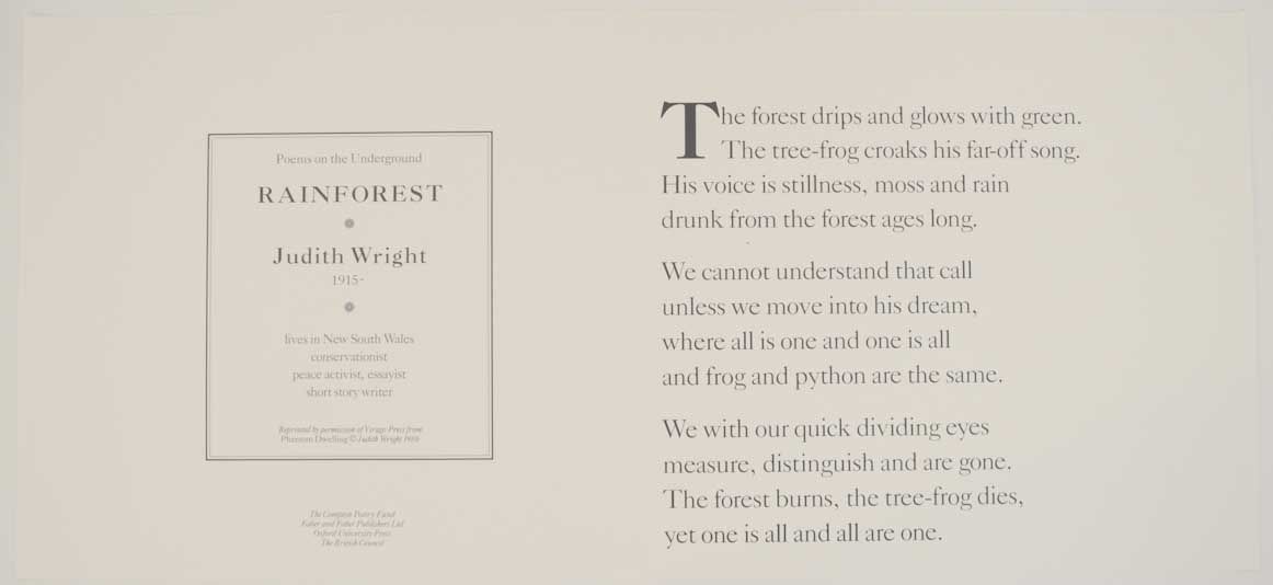 London: Poems on the Underground, nd. Broadside that measures 23.75" wide by 10.75" high. Features the title poem by Wright which was in her collection "Phantom Dwelling." Part of a series of broadsides that were done to be displayed in the London Underground. A near fine copy. Uncommon.