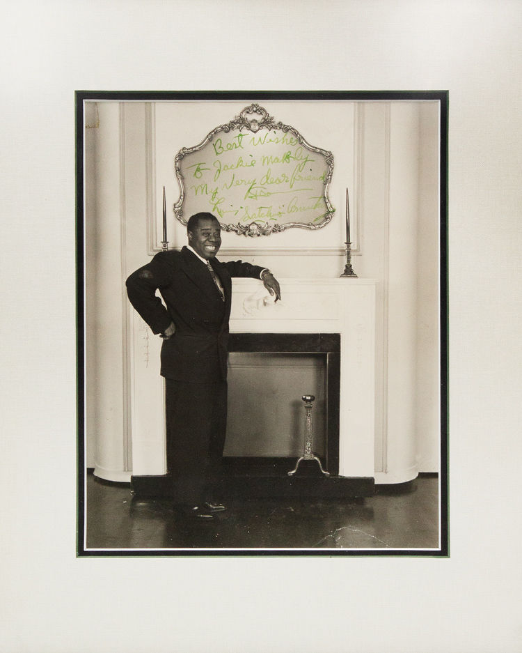 Photograph signed and inscribed in the image ("Louis 'Satchmo' Armstrong), to Jackie "Moms" Mabley, "Best wishes to Jackie Mabley, my dear friend ...