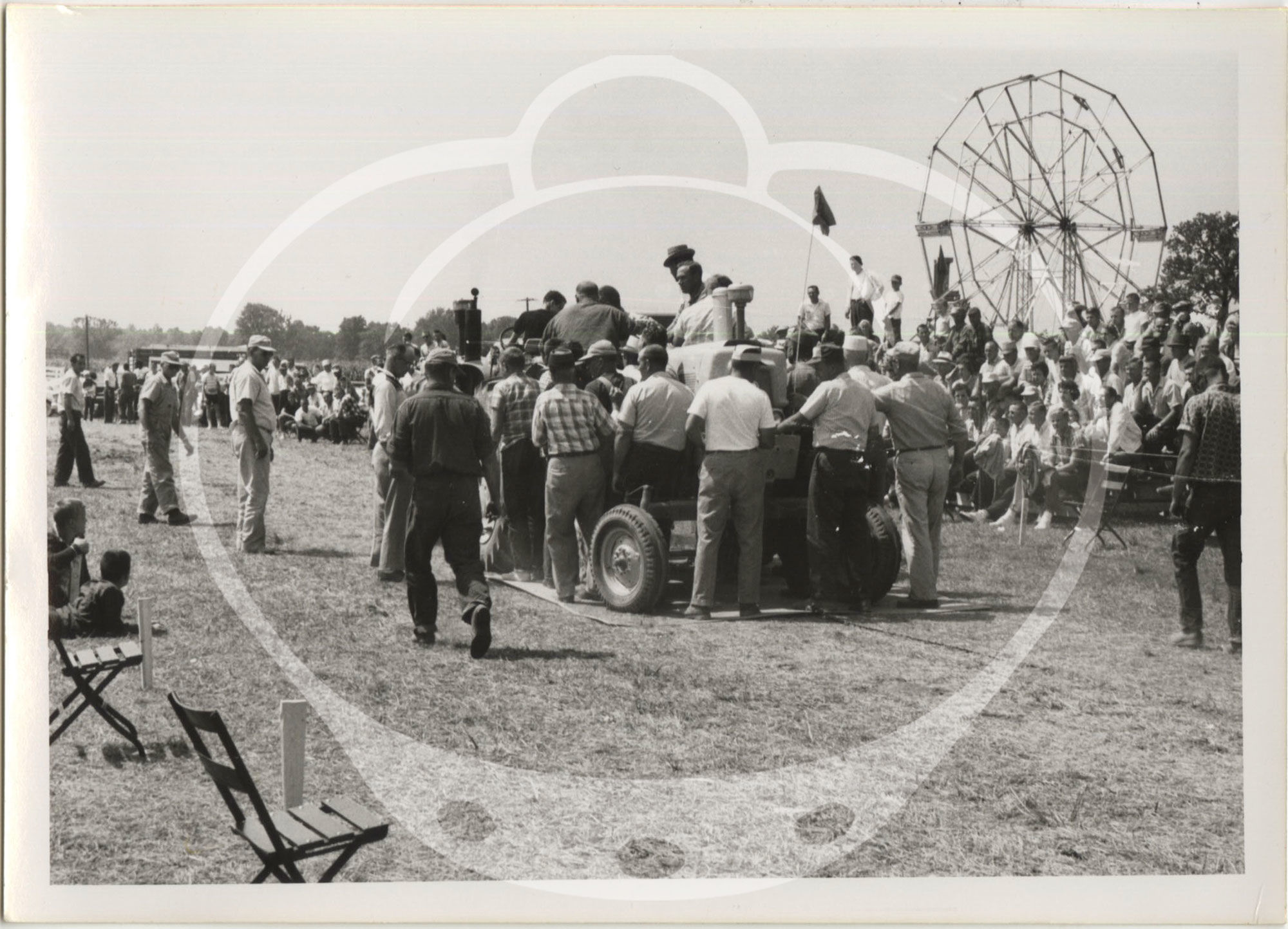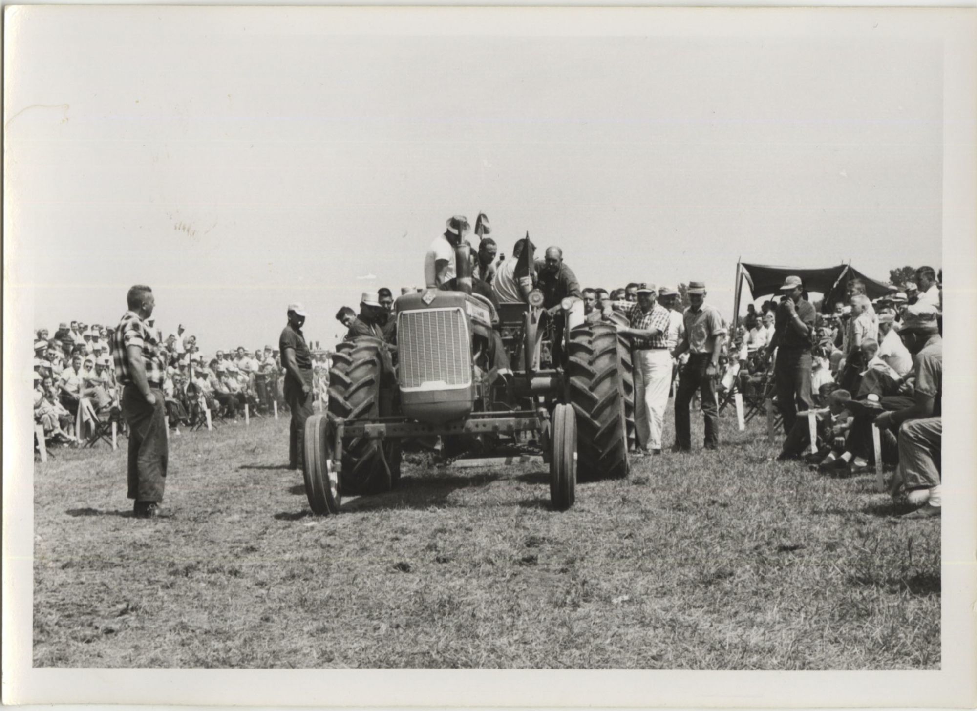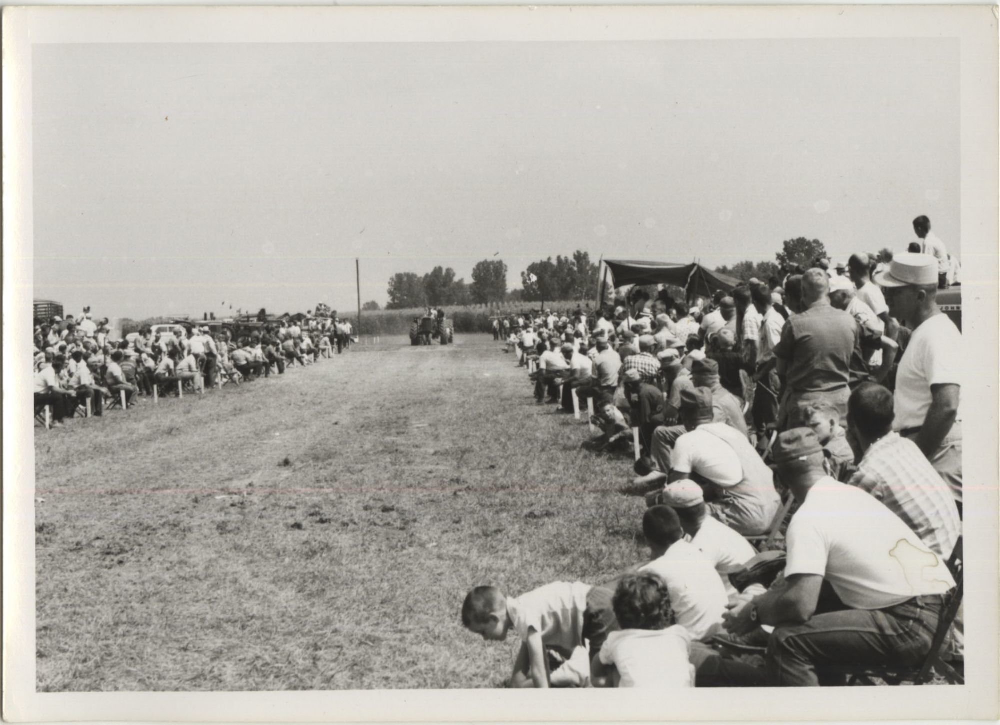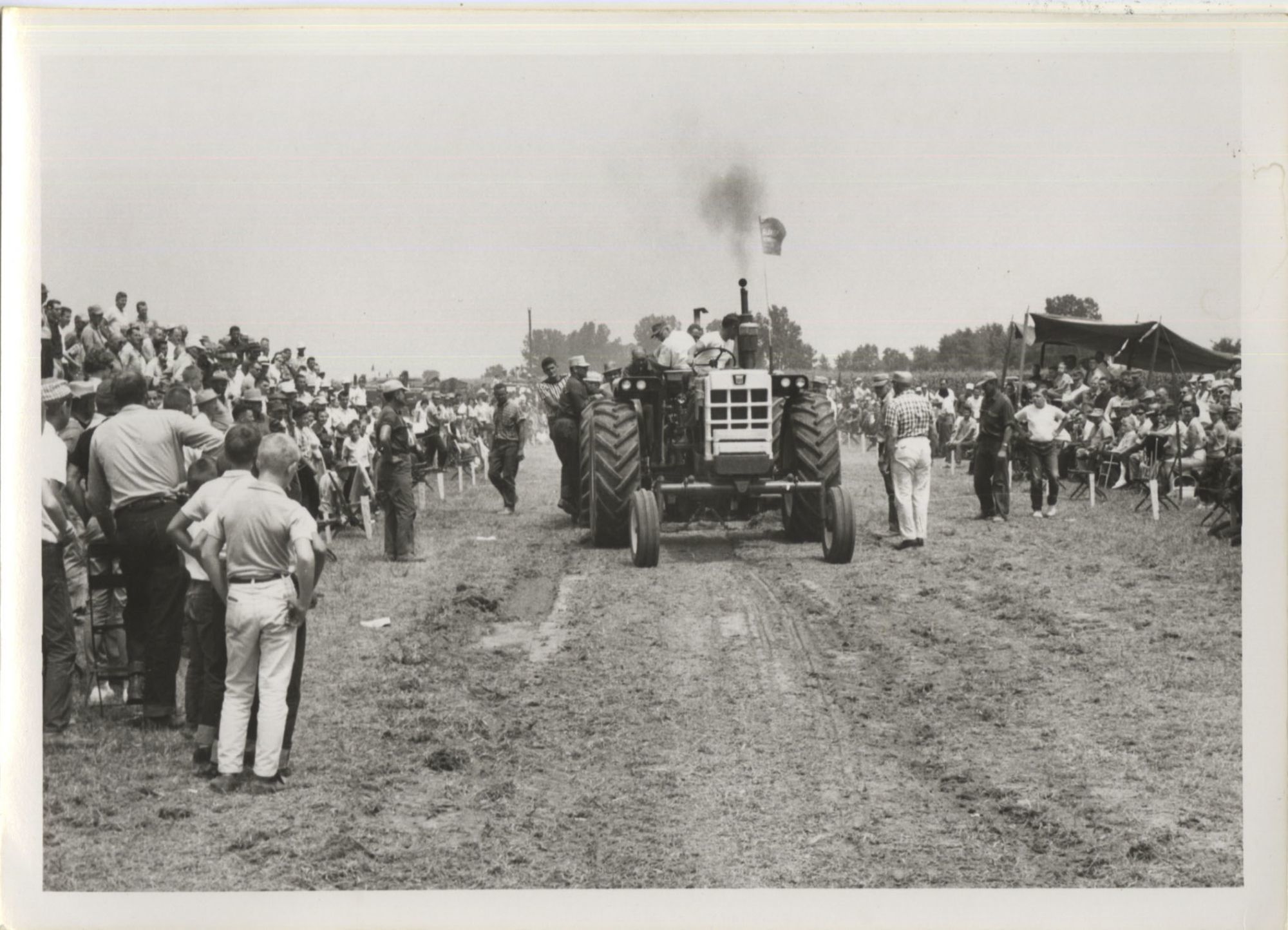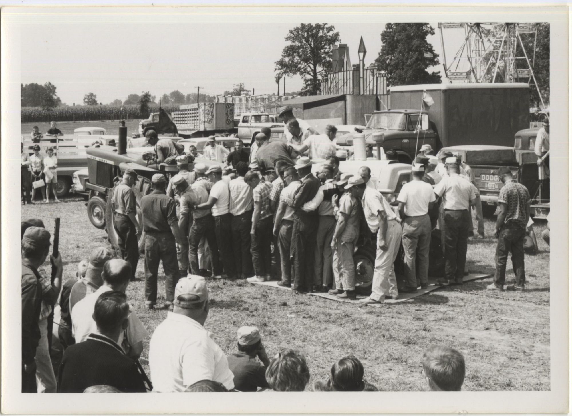 Tractor pulls became popular in the Midwest in the 1950s and 1960s, and endure to this day. Pulls generally consisted of tractors in varying weight classes competing in towing a drag, which was either composed of dead weight or, as indicated in many of the photographs, a group of people stepping onto a sled at fixed positions in order to increase resistance as the pull continued. Farm equipment companies would often sponsor displays of their newest machines at the events, allowing farmers and their families a chance to examine the items up close and, during the pulls themselves, witness the machines' raw power.