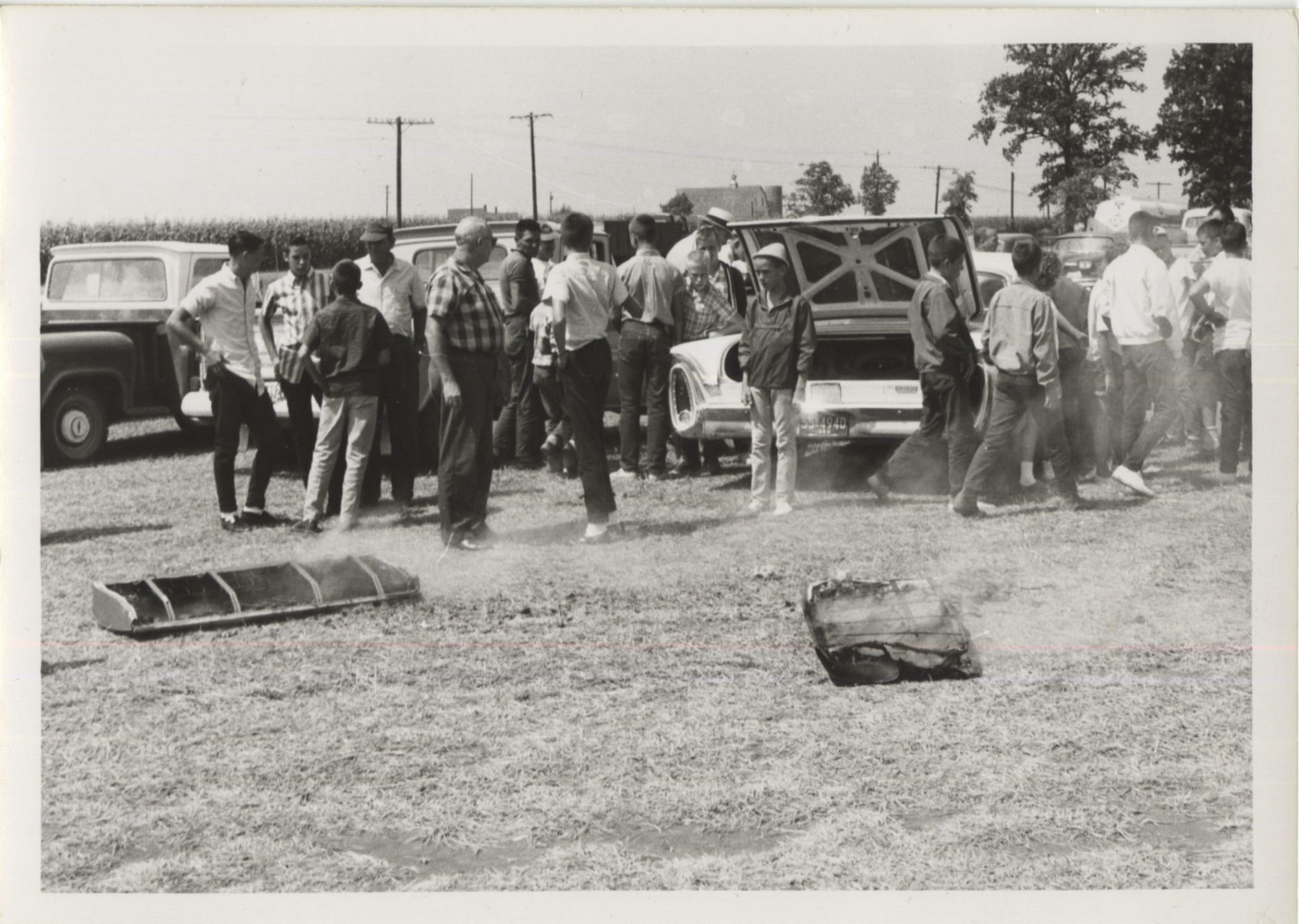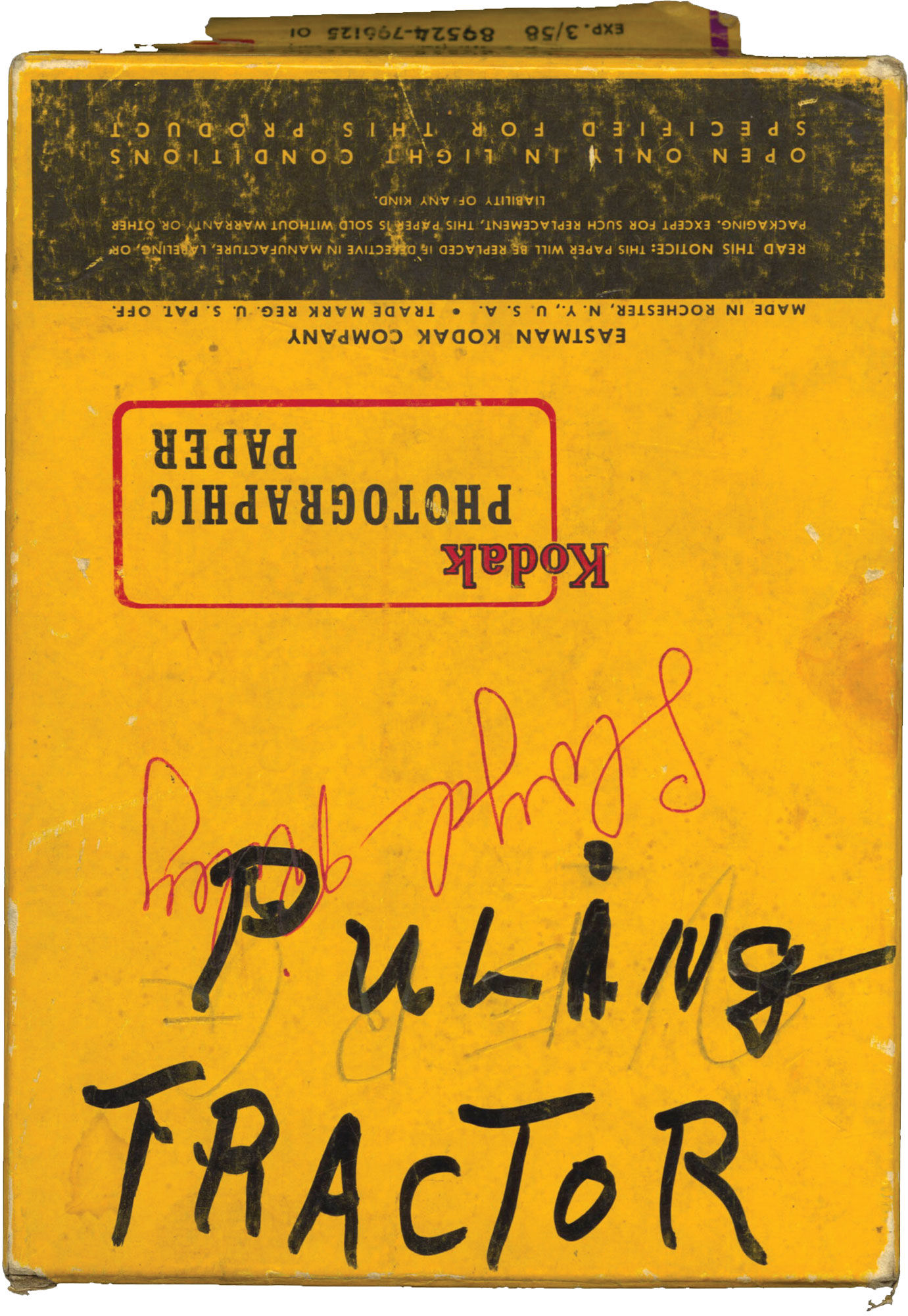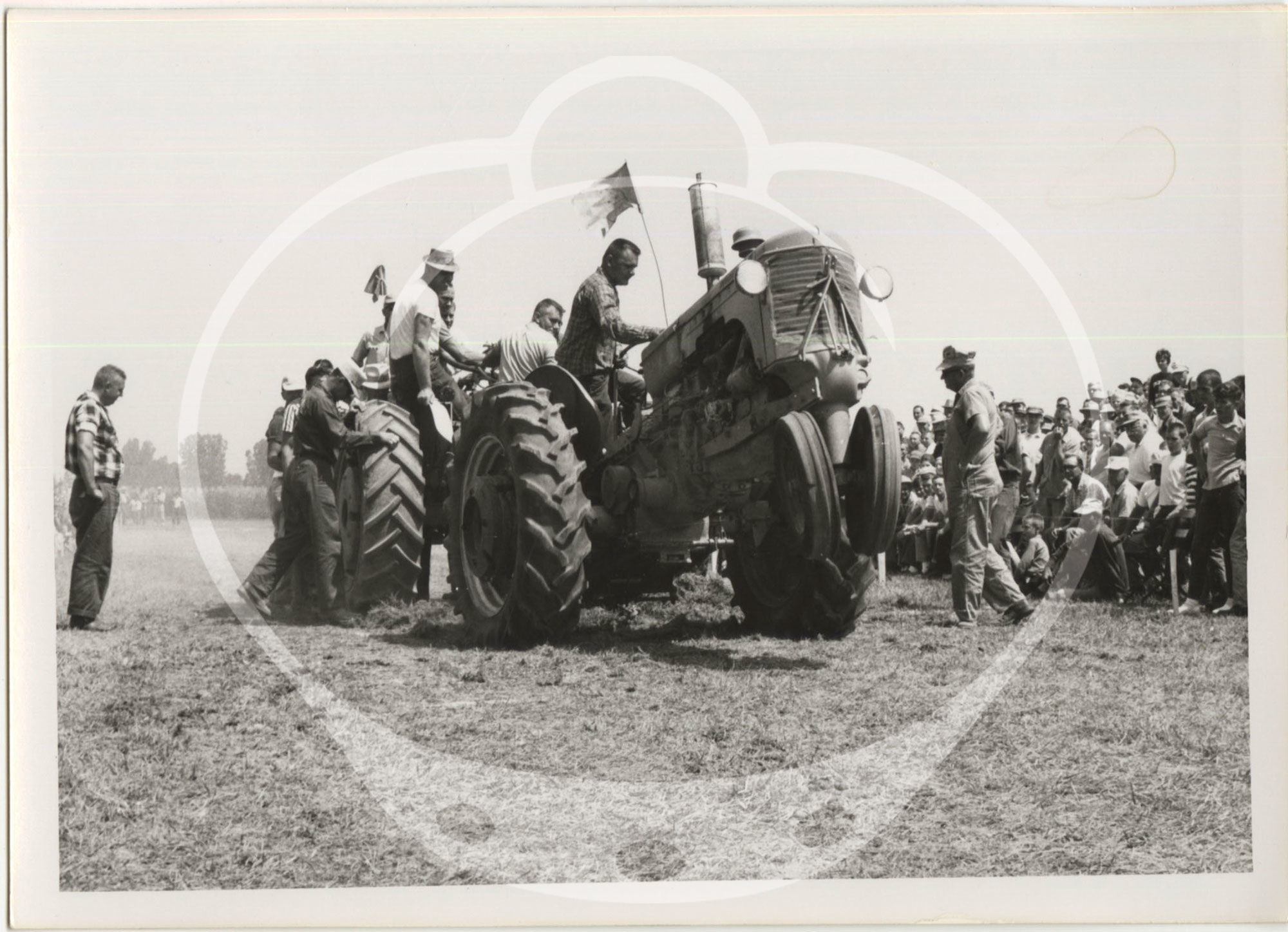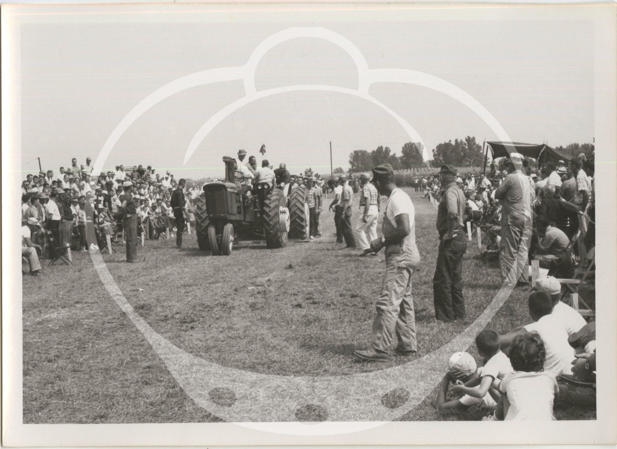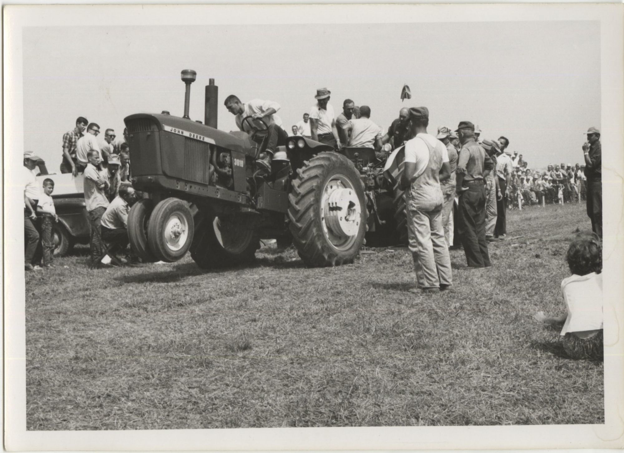 Tractor pulls became popular in the Midwest in the 1950s and 1960s, and endure to this day. Pulls generally consisted of tractors in varying weight classes competing in towing a drag, which was either composed of dead weight or, as indicated in many of the photographs, a group of people stepping onto a sled at fixed positions in order to increase resistance as the pull continued. Farm equipment companies would often sponsor displays of their newest machines at the events, allowing farmers and their families a chance to examine the items up close and, during the pulls themselves, witness the machines' raw power.