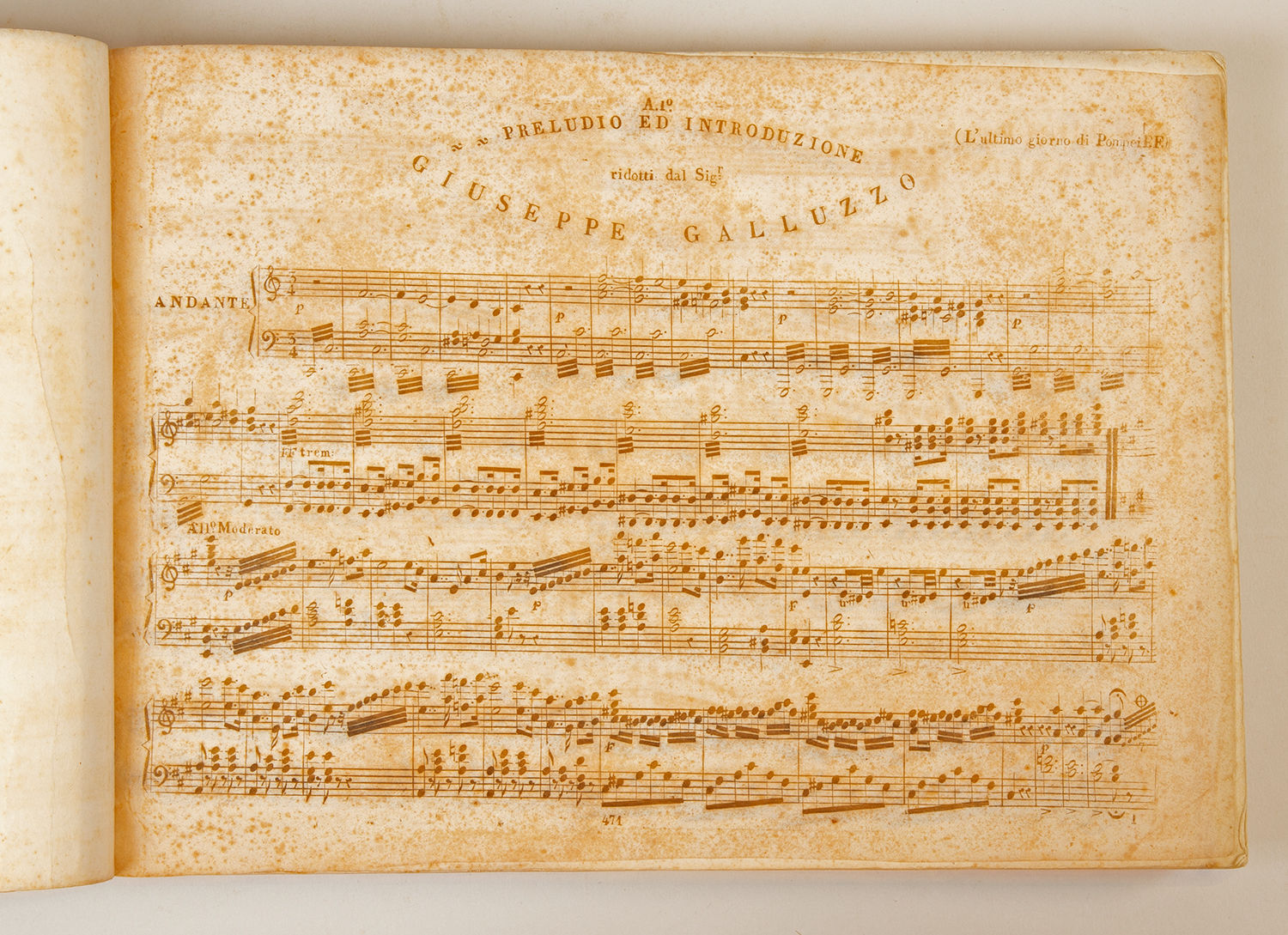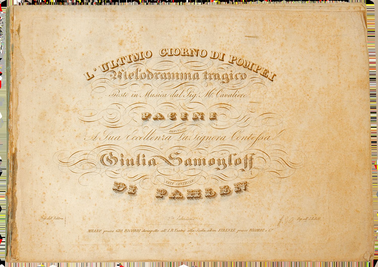 "L’ultimo giorno is typical of the Neapolitan machine operas of its time in incorporating a final cataclysm (like the one in Rossini’s Mosè in Egitto). In his memoirs Pacini discussed innovations in his treatment of several cabalettas in the opera, and his formal experimentation is evident on a larger scale in the Act 1 ensemble ‘Ecco la man di Astrea’. An unsuccessful effort at mounting the opera in Paris (1830) began a series of failures that affected Pacini profoundly and led eventually to his temporary withdrawal from the operatic scene in 1835." Scott L. Balthazar in Grove Dictionary of Opera.