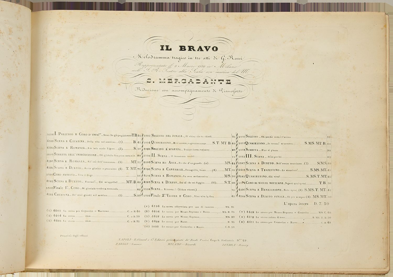 "Il Bravo is one of Mercadante’s most interesting and successful operas. The musical structures show a real attempt to fuse the varied elements of early 19th-century Italian opera into a more continuous dramatic texture. It had a prodigious success at La Scala at the time when the young Verdi had just arrived in Milan, and anyone interested in Mercadante’s influence on his great successor can hardly miss the overtones of Sparafucile, and indeed Rigoletto, in the chief character." Michael Rose in Grove Dictionary of Opera.