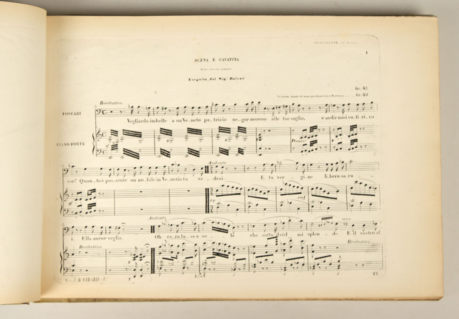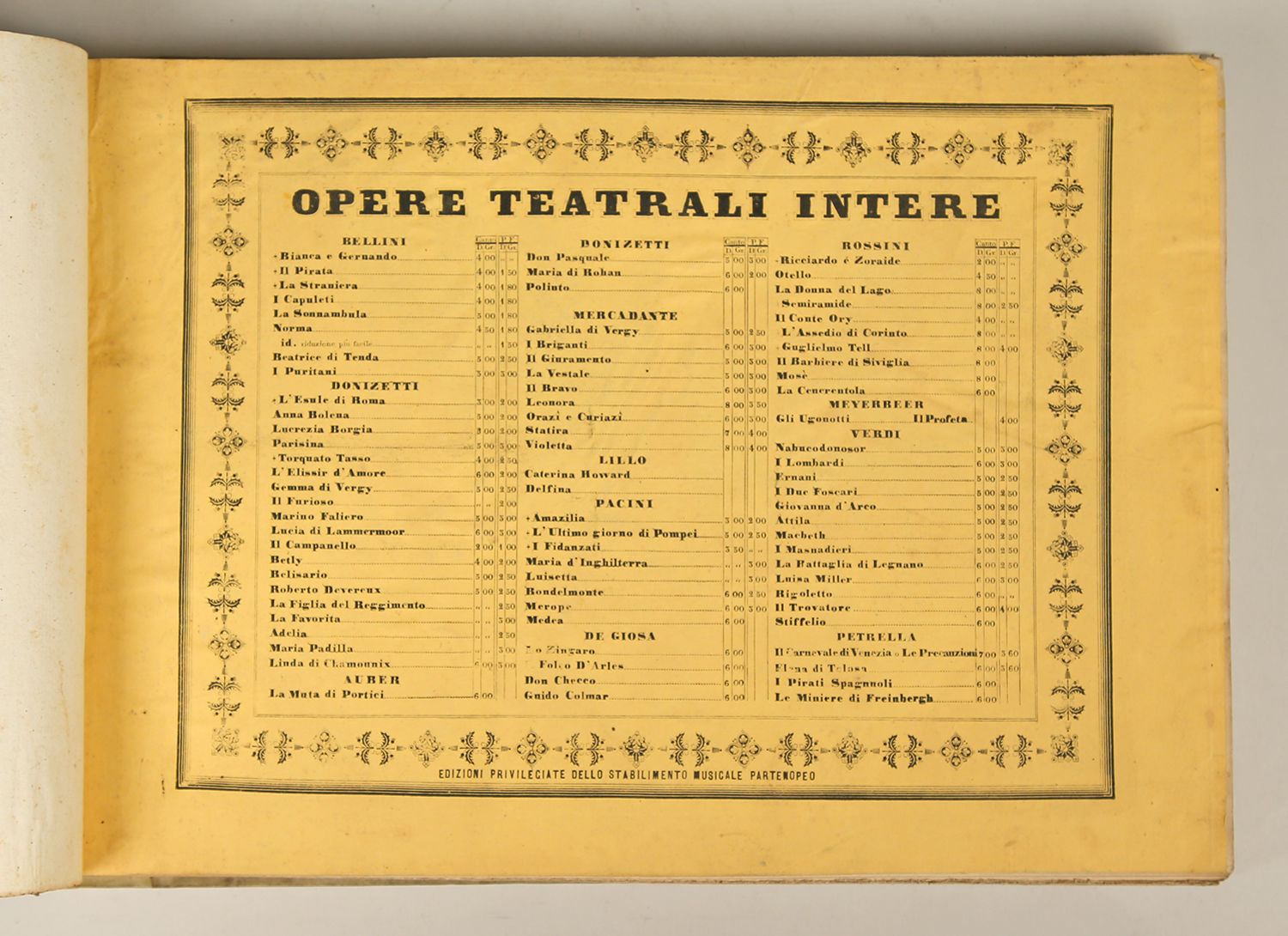 Napoli: B. Girard e Ci. [PNs 4383-97, 5098-5114], 1850. Oblong folio. Vellum-backed and edged dark brown cloth boards, initials "C.G." gilt to upper, titling to spine stamped in black, original publisher's dark yellow wrappers bound in, series title "Opere teatrali intere" and catalogue to upper. 1f. (recto title and contents, verso named cast list, contents), 3-290 pp. Each number with separate caption title and secondary pagination. Engraved.