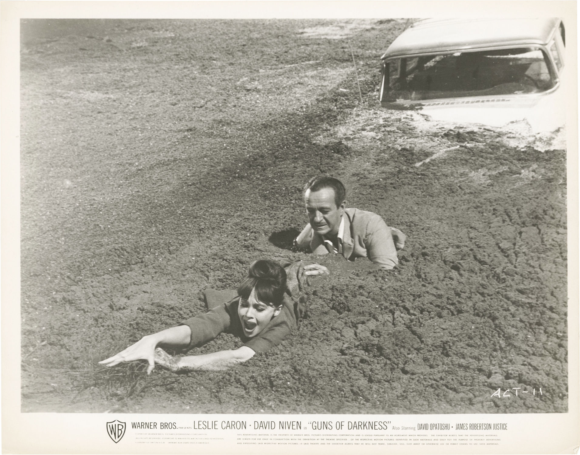 Burbank, CA: Warner Brothers, 1962. Vintage studio still photograph of Leslie Caron and David Niven in quicksand, from the 1962 film.