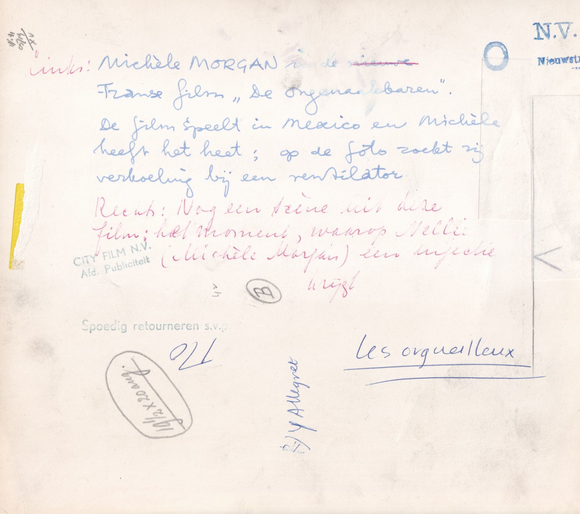 N.p.: N.p., 1953. Vintage borderless double weight reference photograph from the 1953 French film, showing actress Michele Morgan. With manuscript ink annotations regarding layout on the verso, along with the stamp of City Film N.V.
