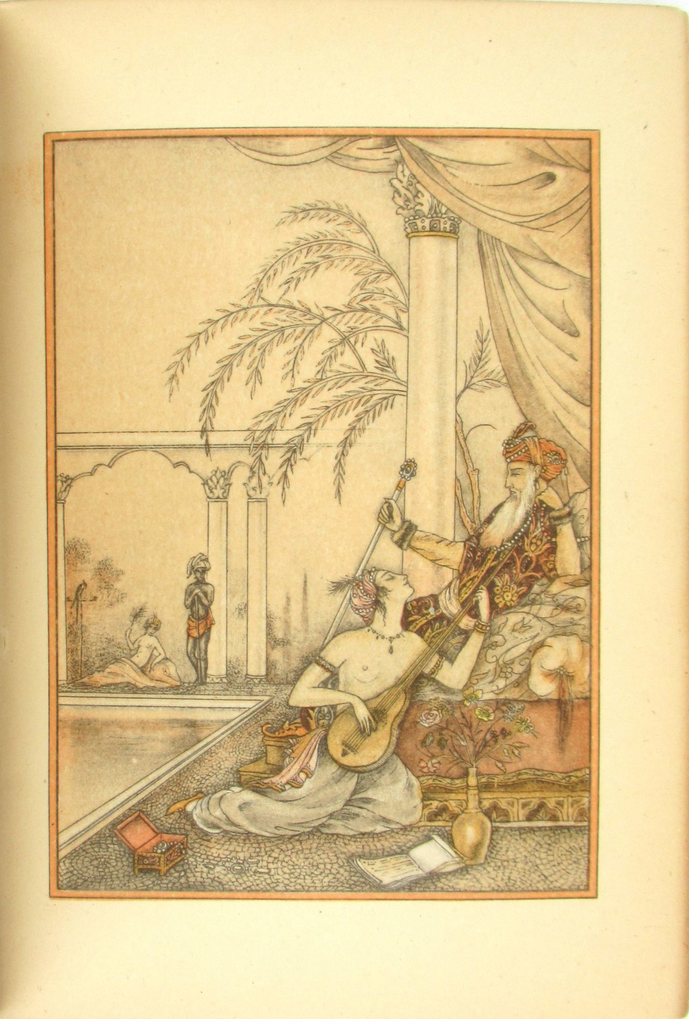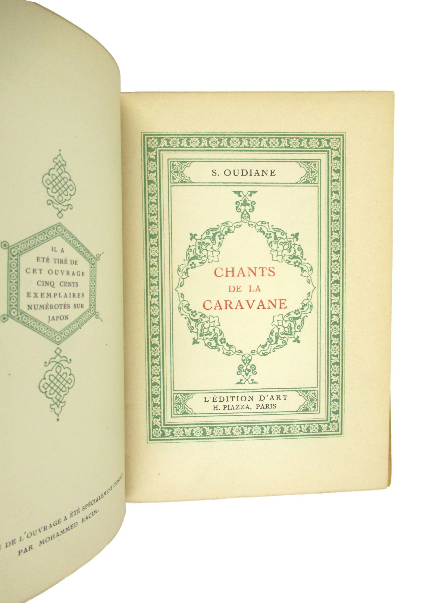 Paris: L'Édition d'Art H. Piazza, 1926. Very Good. Paris: L'Édition d'Art H. Piazza, 1926. Huitième Édition. 12mo (15.5cm.); publisher's full deluxe panelled mottled morocco, gilt- and blind-tooled spine, top edge gilt, elaborate floral gilt dentelles, marbled endpapers, decorative wrappers bound in; 121pp.; color frontispiece by Paul Zenker, text printed within green decorative border with red head- and tail-pieces throughout. Leather a bit scuffed at extremities, especially spine joints, endpapers rather brittle with brief chipping along margins and paper flaw to front pastedown from previously removed ex libris, else Very Good, contents clean and sound. A rather sweet collection of Orientalist poetry.