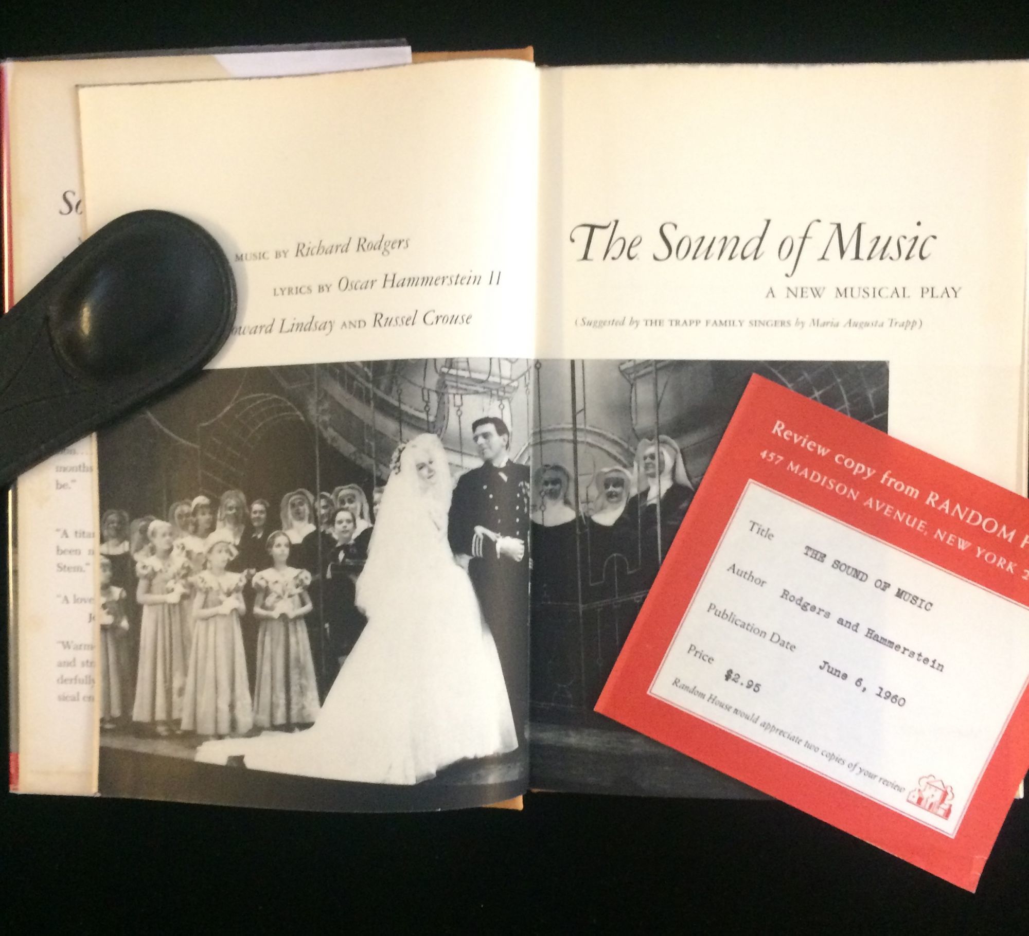 NY: Random House, 1960. 1st Edition. Hardcover. Very Good +/Very Good +. Review copy with review slip laid-in. Orange cloth backed covers with b&w pastedown of Mary Martin. Dustjacket is price-clipped. The original Broadway musical about the Von Trapp family's escape from Nazi Austria, which became the beloved blockbuster movie musical with Julie Andrews. Book covers are a bit spotted around the edges and to the cloth spine. Dustjacket a bit rubbed, still, very presentable.