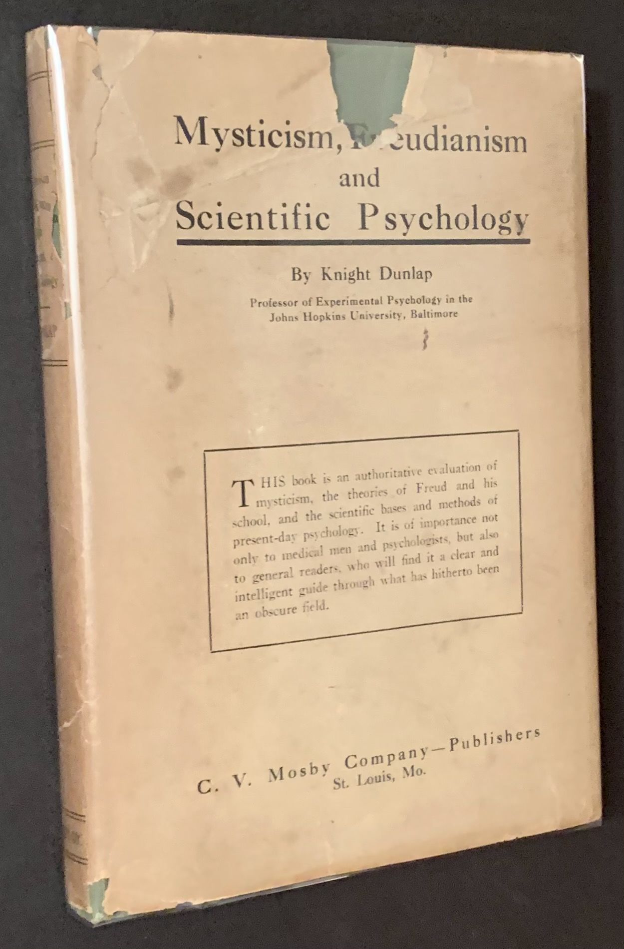 St. Louis: C.V. Mosby Company, 1920. Cloth. Near Fine/Very Good -. An impressive copy of the 1920 1st edition, in its uncommon dustjacket. Clean and Near Fine in a bright, Good+ to VG- example of the fragile beige dustjacket, with a 1" chip at the front panel's top-edge and several closed tears --and light chipping-- along the panel edges. 12mo, the book's 3 chapters (in order) are: "Mysticism", "Freud and the Psychoanalysts" and "The Foundations of Scientific Psychology