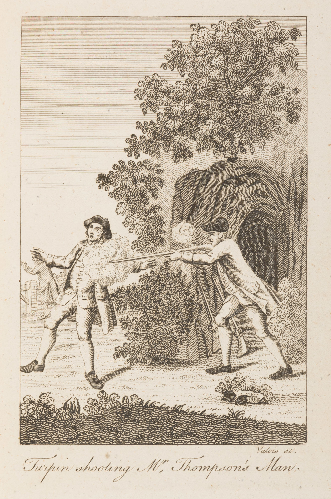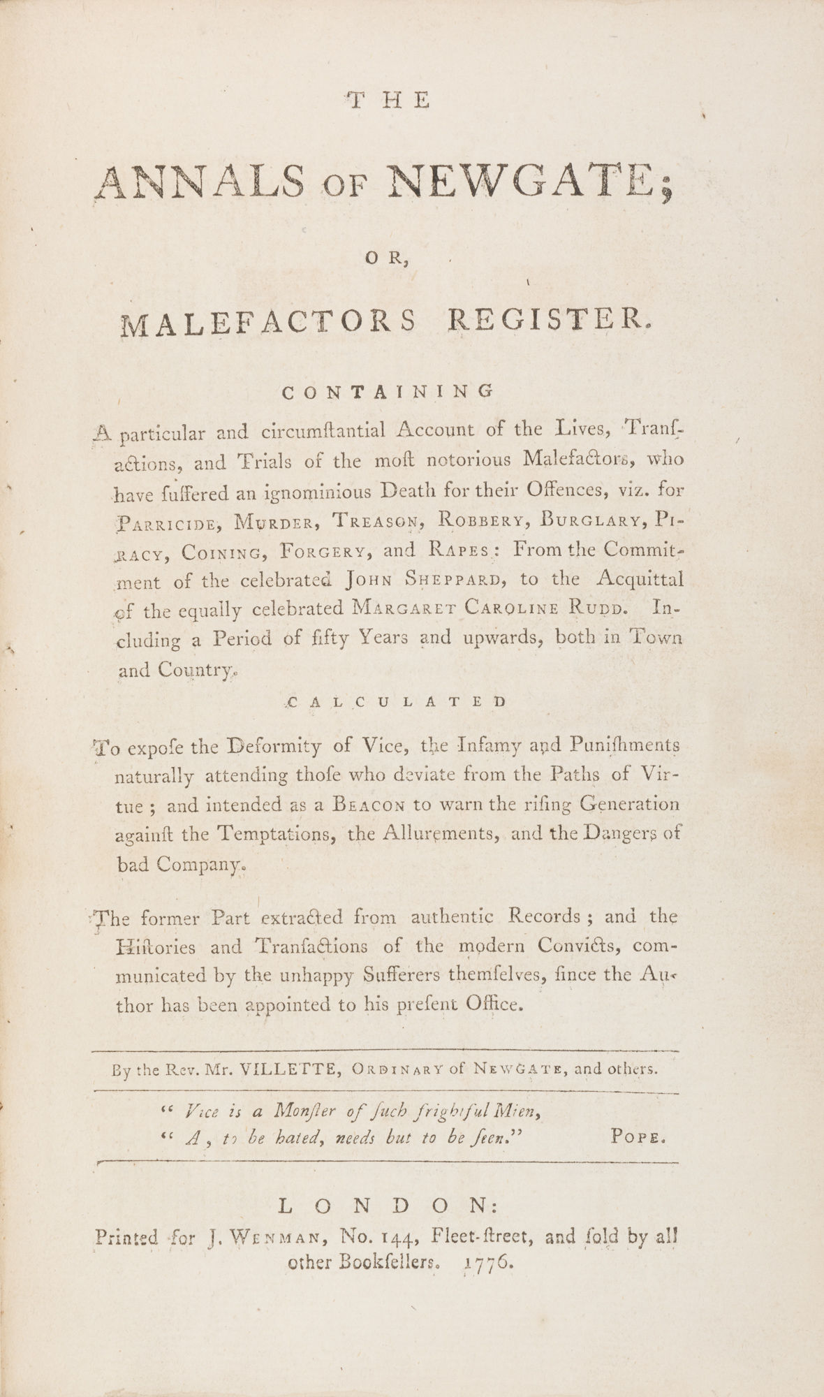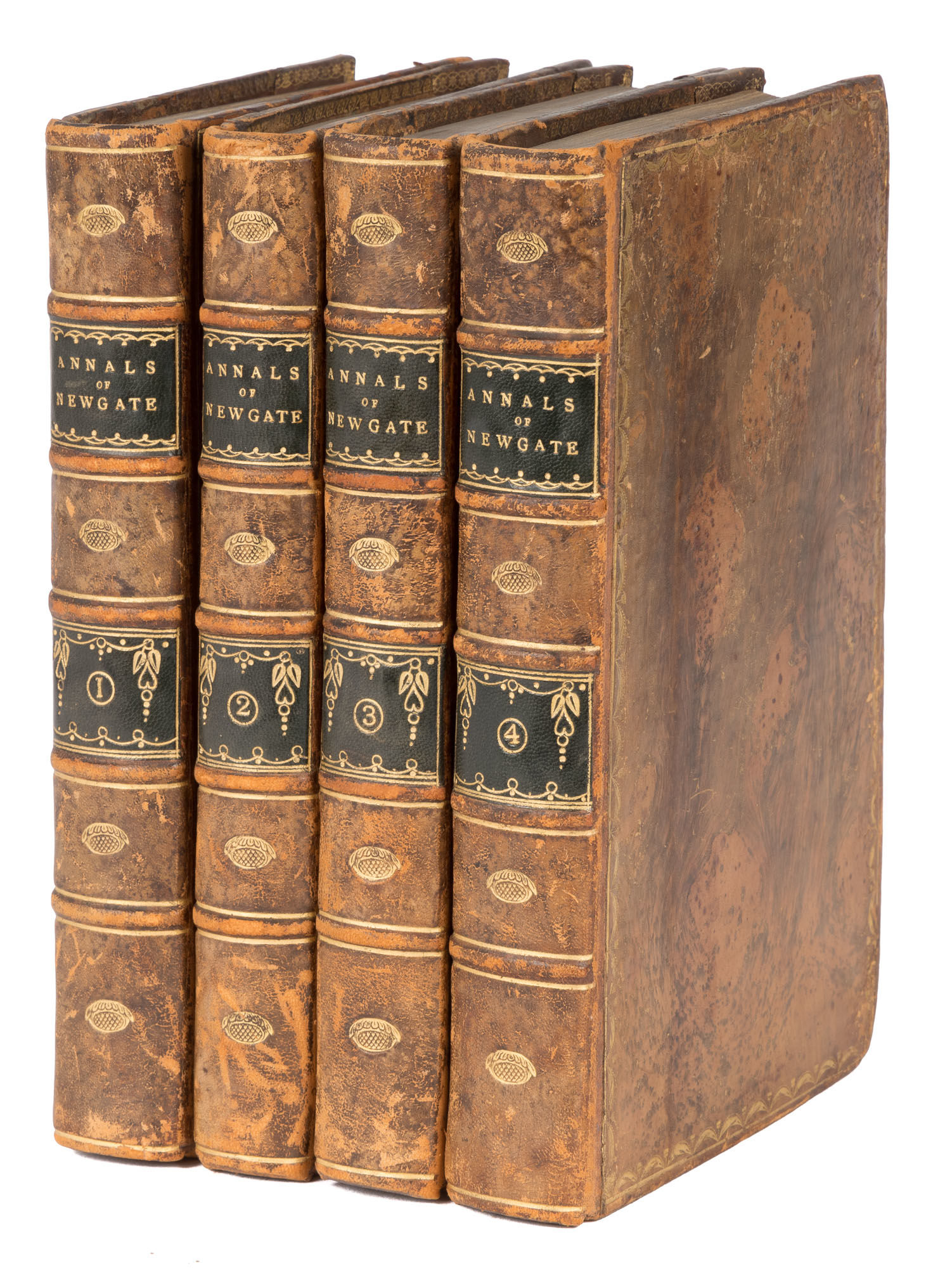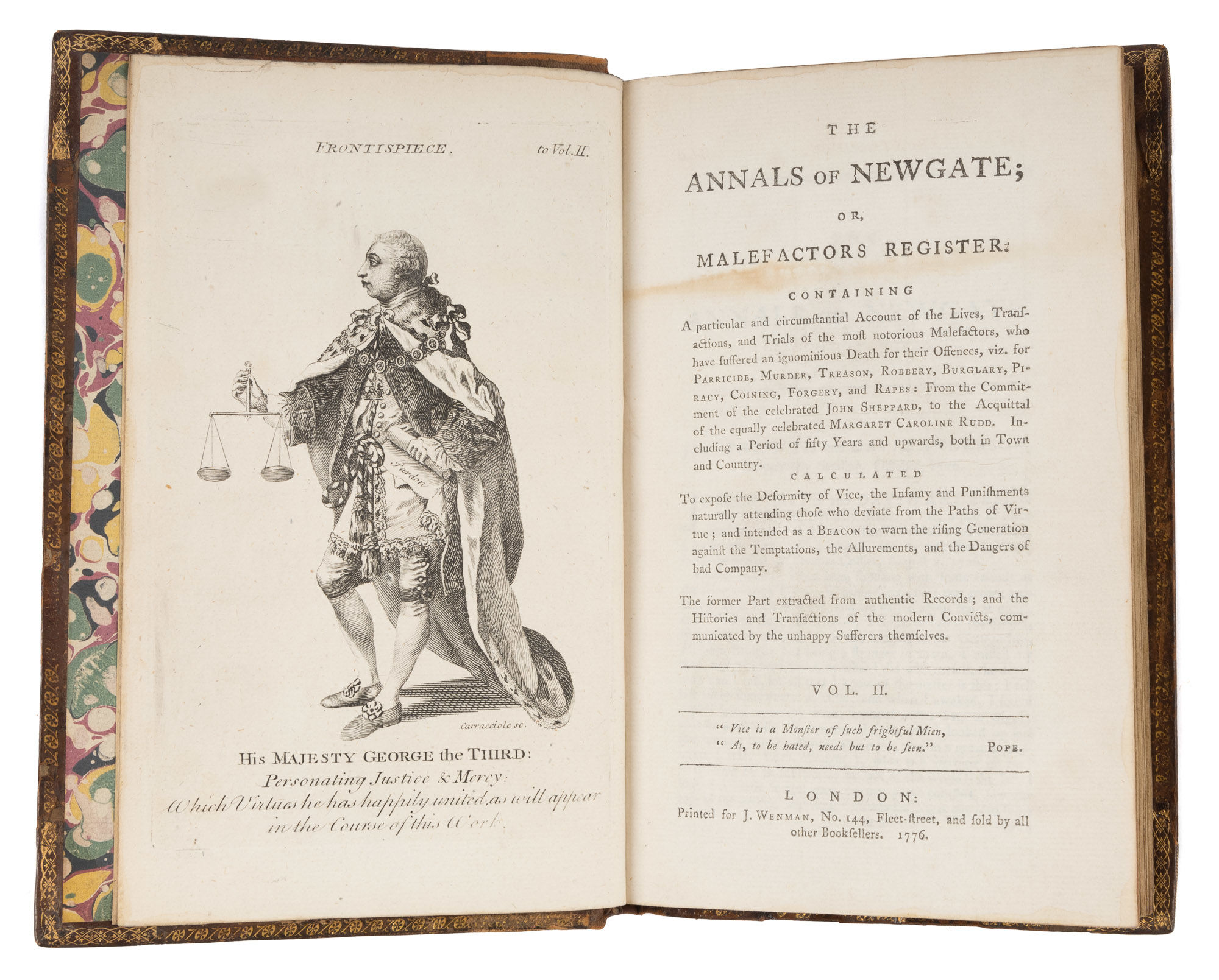 1776. London: Printed for J. Wenman, 1776. 4 vols.. London: Printed for J. Wenman, 1776. 4 vols. Illustrated Accounts of "The Most Notorious Malefactors" of Eighteenth-Century Britain Villette, John, Primary Author. The Annals of Newgate; Or, Malefactors Register. Containing a Particular and Circumstantial Account of the Lives, Transactions, And Trials of the Most Notorious Malefactors, Who Have Suffered an Ignominious Death for Their Offences, viz. for Parricide, Murder, Treason, Robbery, Burglary, Piracy, Coining, Forgery, And Rapes: From the Commitment of the Celebrated John Sheppard, To the Acquittal of the Equally Celebrated Margaret Caroline Rudd. Including a Period of Fifty Years and Upwards, Both in Town and Country. Calculated To Expose the Desormity of Vice, The Infamy and Punishments Naturally Attending Those who Deviate from the Paths of Virtue; And Intended as a Beacon to Warn the Rising Generation Against the Temptations, The Allurements, And the Dangers of Bad Company. The Former Part Extracted from Records; And the Histories and Transactions of the Modern Convicts, Communicated by the Unhappy Sufferers Themselves, Since the Author has Been Appointed to His Present Office. By the Rev. Mr. Villette, Ordinary of Newgate, And Others. London: Printed for J. Wenman, 1776. 4 volumes. 37 copperplates, 3 are frontispieces in Volumes I-III. One plate in Volume I misbound (it faces p.396, not p.395). All plates present, text complete. Octavo (8-1/4" x 5-1/4"; 21 x 13.3 cm). Contemporary tree-calf, gilt fillets to boards, rebacked with raised bands, notably attractive renewed lettering pieces and gilt ornaments to spines, gilt tooling to board edges, marbled endpapers. Light rubbing and a few minor nicks and scratches to boards, somewhat heavier rubbing to extremities, hinges cracked or starting. Moderate toning, light foxing in a few places, some offsetting from plates, leaves B1-B2 (pp.1-4) in Volume III just beginning to detached, but secure. A handsome set. $2,500. * Only edition. Presented as a "beacon to warn the rising generation," Villette's chronicle provides accounts of some of the most infamous criminals of eighteenth-century England, such as Sarah Malcolm, Eugene Aram, Elizabeth Brownrigg and Richard Turpin. The plates, some of them quite lurid, depict criminals, crimes and execution. OCLC locates 6 copies in North American law libraries (Case Western Reserve University, Harvard, Library of Congress, U.