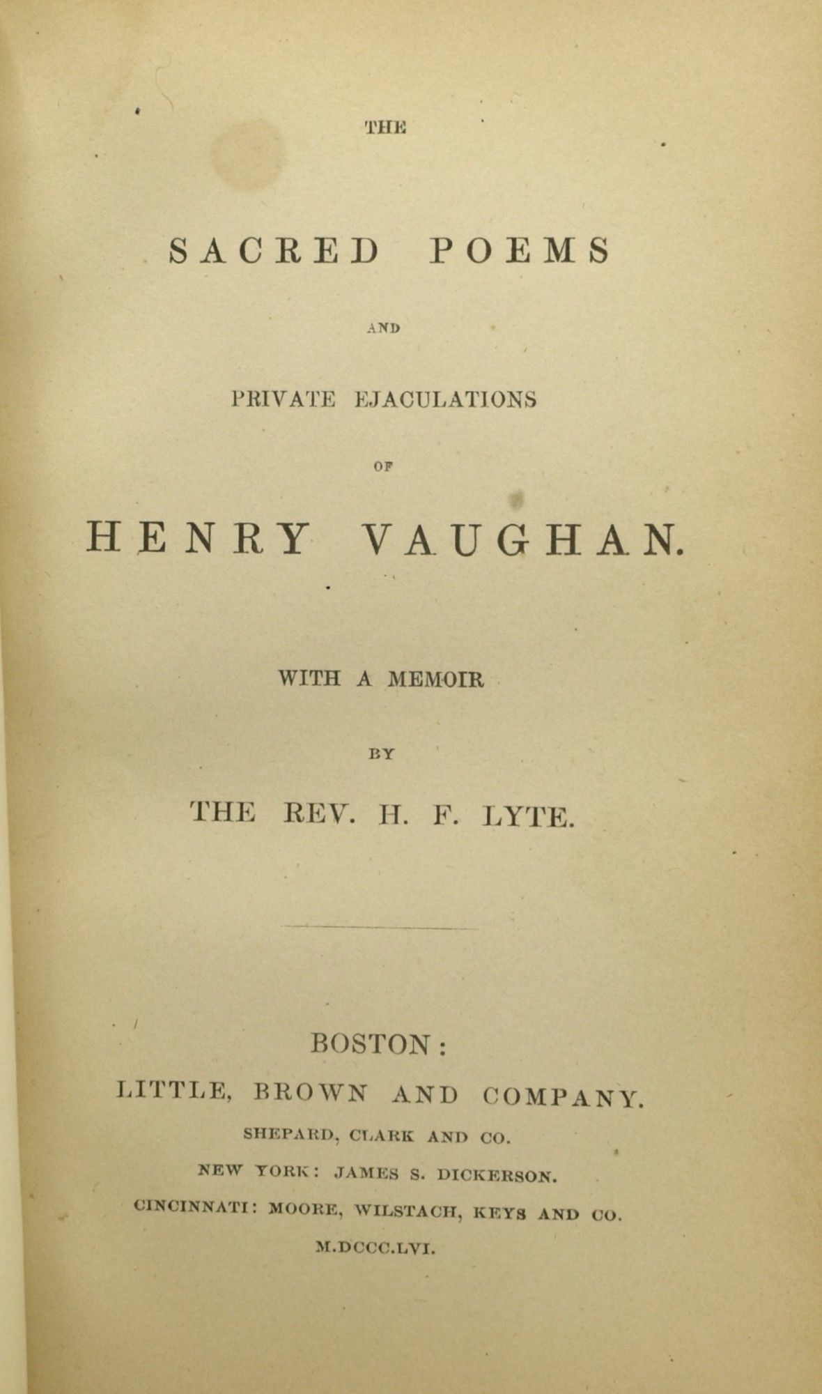 Boston: Little, Brown and Company, 1856. Full Leather. Very Good binding. Attractively bound in black calf, ruled in blind in a 'mock Cambridge-style" binding; raised bands, with blind rules in compartments and titling in gilt. There is wear and scuffing to the joints and the corners. With marbled endpapers and all edges gilt. ~~Previous owner name with gift inscription on the first blank leaf; a drop of what appears to be iron gall ink obscures the first initial. The inscription is dated in the year of publication.~~The text is preceded by the Rev. H. F. Lyte's Biographical Sketch of Vaughan. Very Good binding.
