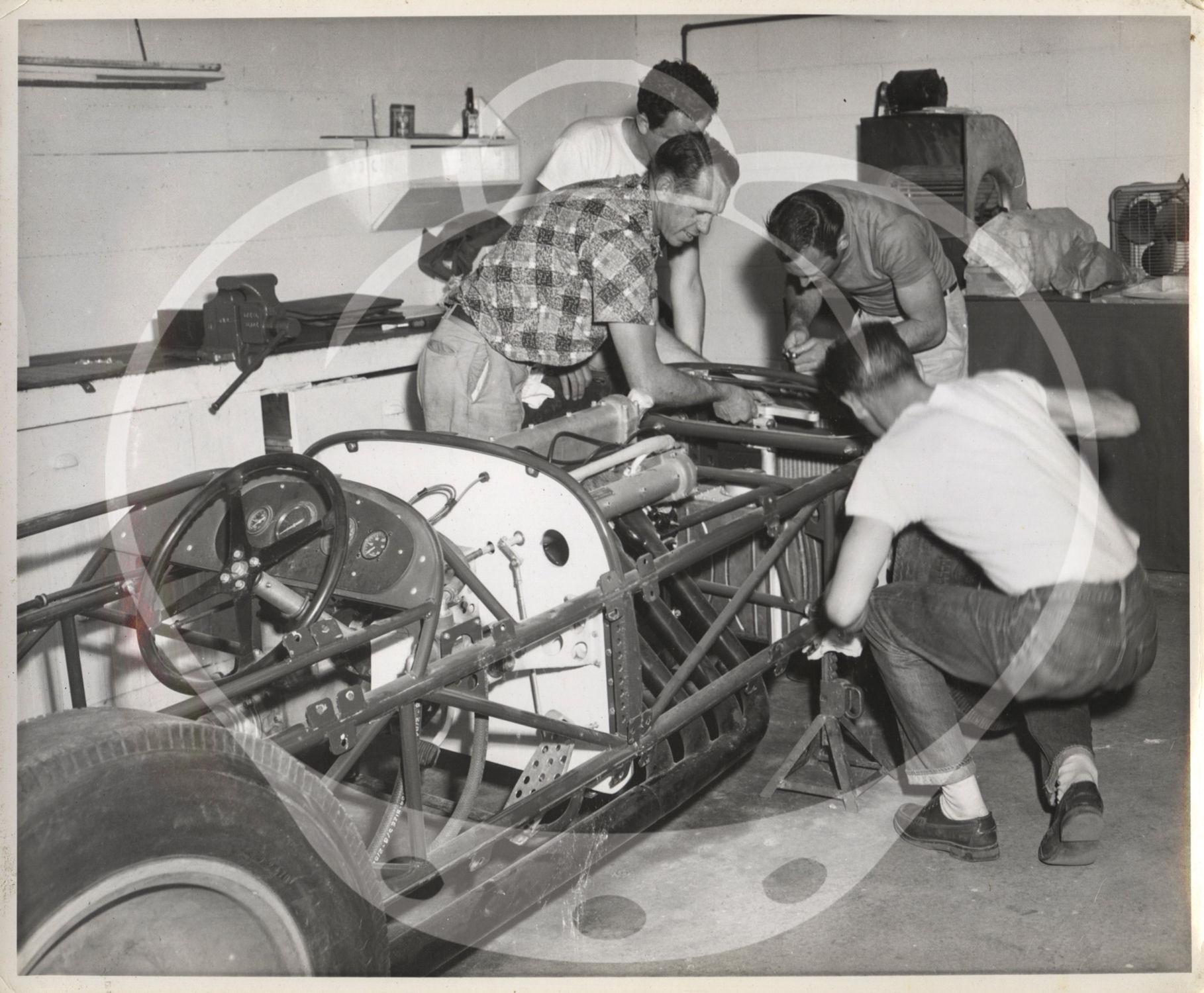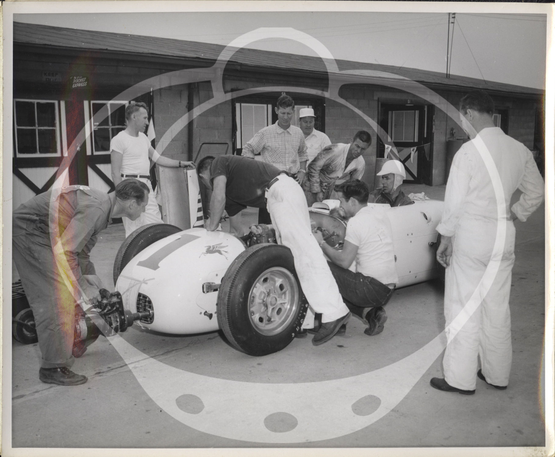 The 1955 album contains 12 photographs, capturing the moments before the 500, with several views of the team performing last-minute modifications to the Kuzma-Offenhauser, better known as the Dean Van Lines #2 Special, custom-built by Eddie Kuzma for the 1955 race. Also included in the album are several action shots of the race itself, along with a single photograph of Bryan posing behind the wheel of Dean's #7 Champ car.