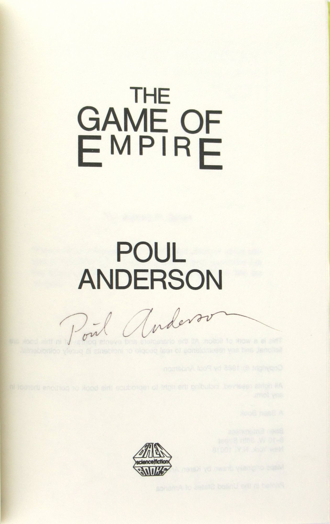 New York: Baen Books, 1985. Very Good +/Very Good. New York: Baen Books, 1985. Book Club Edition. Signed by Anderson on title page without inscription. Octavo. 182 pages. Illustrated dust jacket. Yellow boards stamped in black.