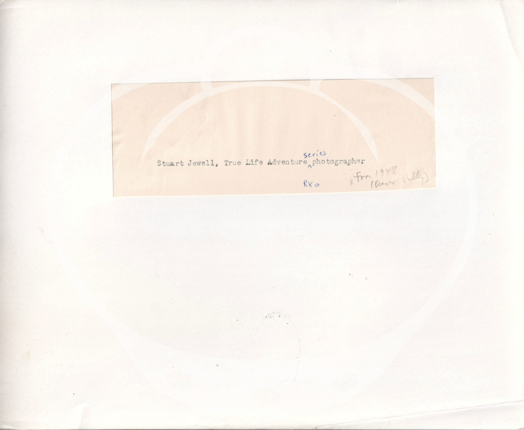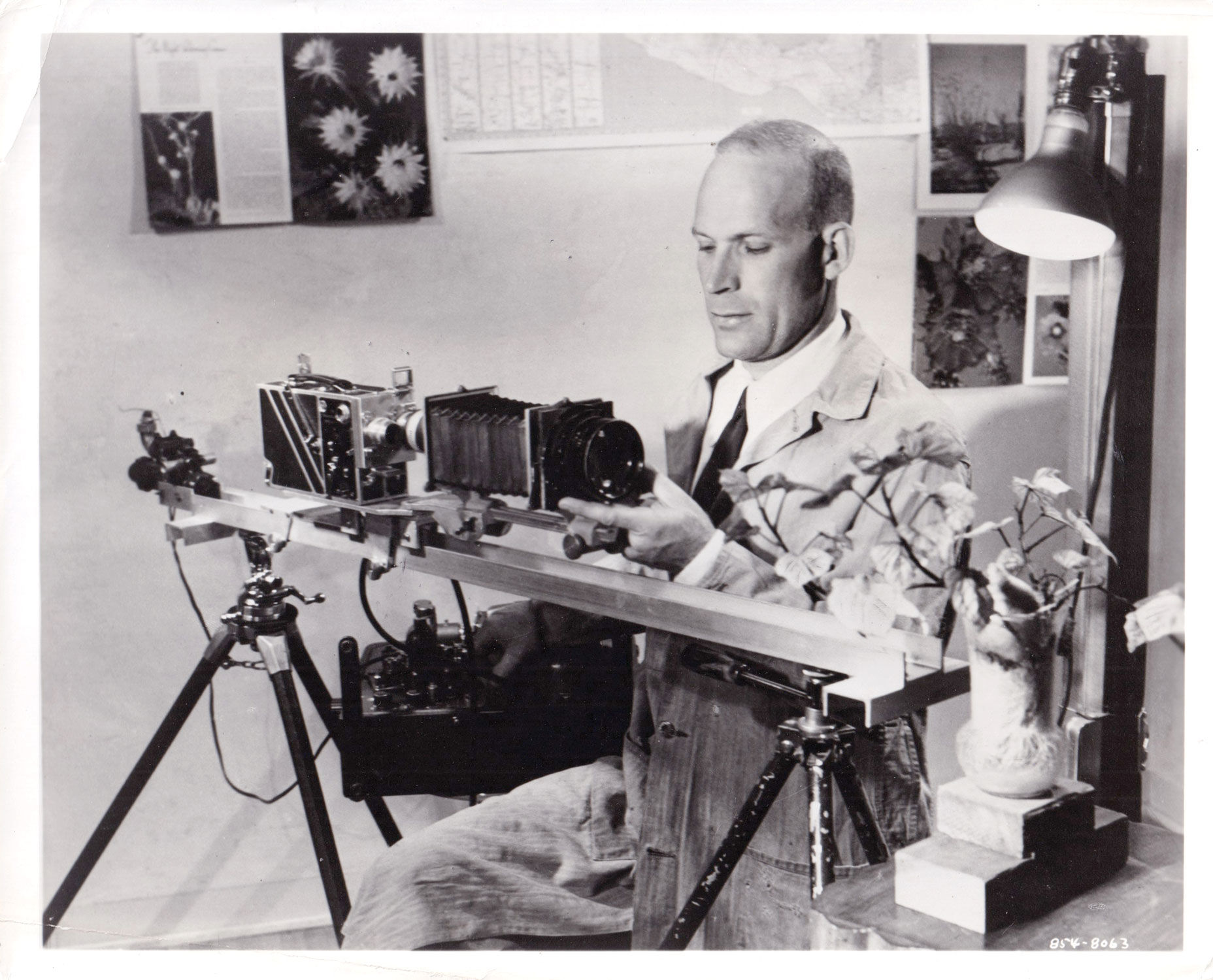 Burbank, CA: Walt Disney Productions / RKO Radio Pictures, 1948. Vintage photograph of photographer and cinematographer Stuart Jewell adjusting a camera while capturing a time-lapse shot for Beaver Valley (1950). Printed mimeo snipe on the verso, with manuscript pencil annotations noting the year and title of the film. From the archive of film historian and author Joel Finler.