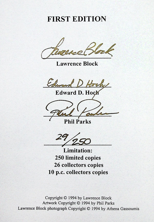 Lawrence Block, illustrator- Phil Parks, and Edward D. Hoch who wrote the intro. Block was named a Grand Master by the Mystery Writers of America in 1994, the year of publication.