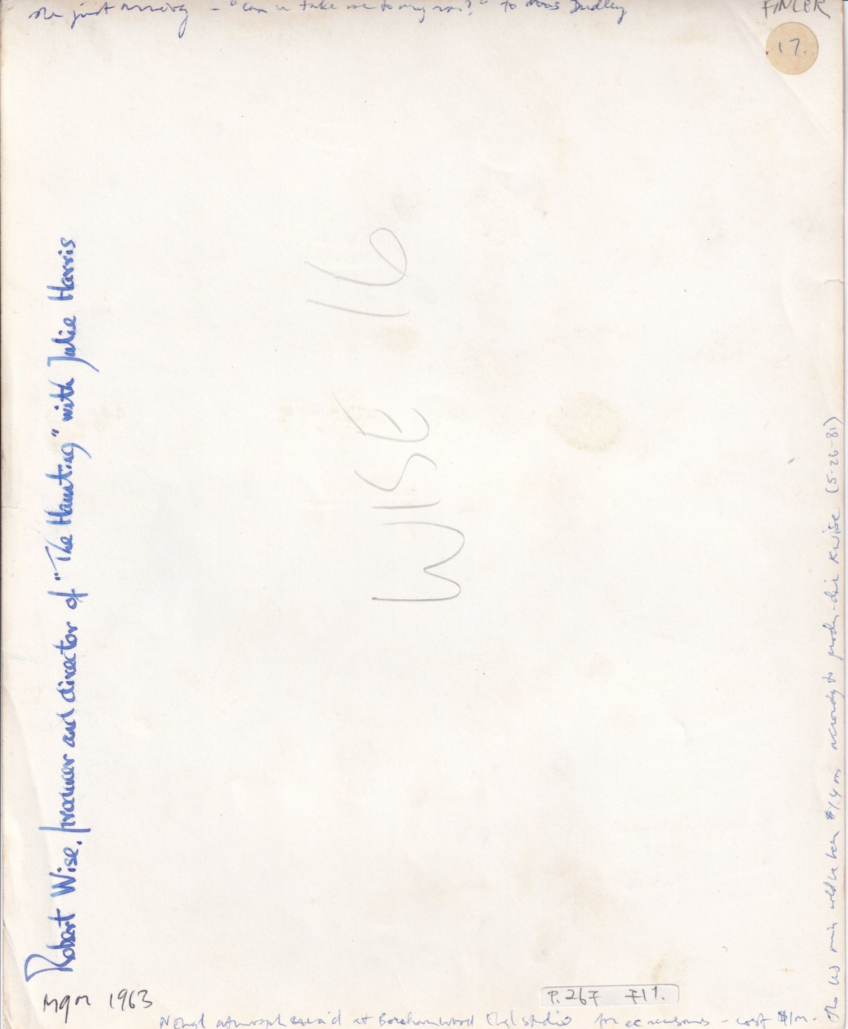 N.p.: N.p., 1963. Vintage reference photograph of director Robert Wise and actress Julie Harris on the set of the 1963 film. With manuscript ink annotations on the verso.