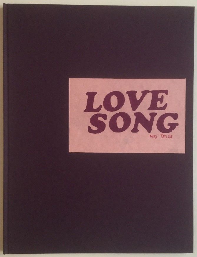 "Love Song is a complexly layered silkscreened artist book with a handsewn cover. The text and rich imagery explore and critique the heterosexual, monogamous and eroticized underpinnings of the concept of love, starkly juxtaposing romantic sentiments with commodification. Mike Taylor layers pop culture love song crooners such as Justin Bieber and the Supremes with historical figures depicting love, such as Degas, 16th century religious paintings and ancient Mesopotamia, exploring the constructed concept of love." [Booklyn]. Tight, bright, and unmarred. Pink printed cloth boards, purple and red ink lettering, silkscreened. fo. np. Illus. (color plates). Limited edition of 14 copies. Laid in sheet with Citations.