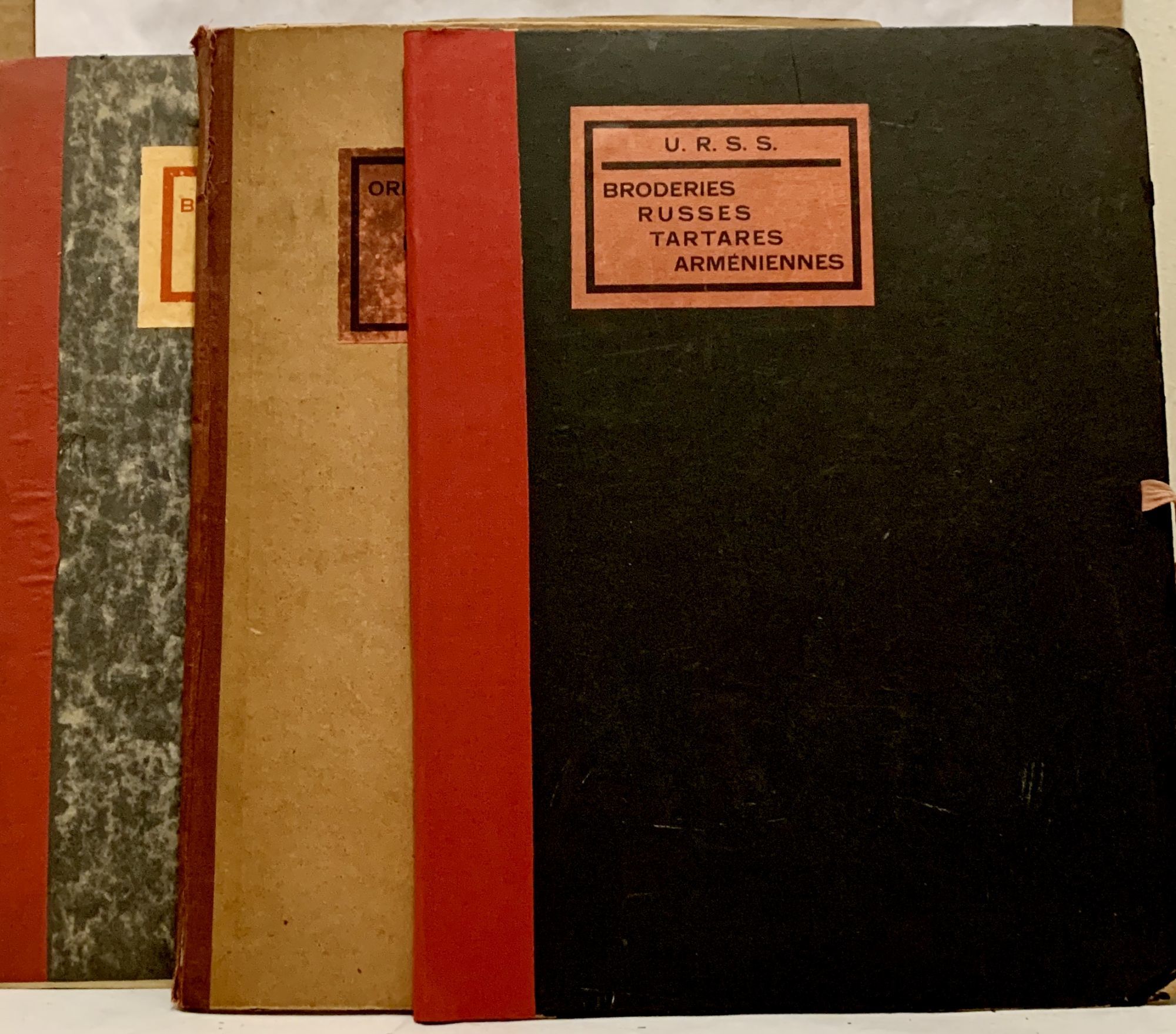 Paris: Henri Ernst, 1920. First edition. Hardcover. Three portfolios in marbled boards, brown and black boards respectively with contents loose as issued laid-in. Very good. Folios, 38.5 x 28.5 cm. All contents in French, and retrospectively -- 4 page text Espagnoles by J. Villaba (30 plates with locals); Finnois & Siberiens, 4 pages text with map (28 plates with locals); Russes Tartares Armeniennes (40 plates with locals and hand written translation of their explanations in English). Each page of the latter housed in plastic covers and backed by stiff board sheets. Each portfolio with front cover paper label, surface and backstrip wear, Siberian portfolio spine reinforced in red cloth, and all portfolios with functional, original cloth ties. Plates generally clean and bright.