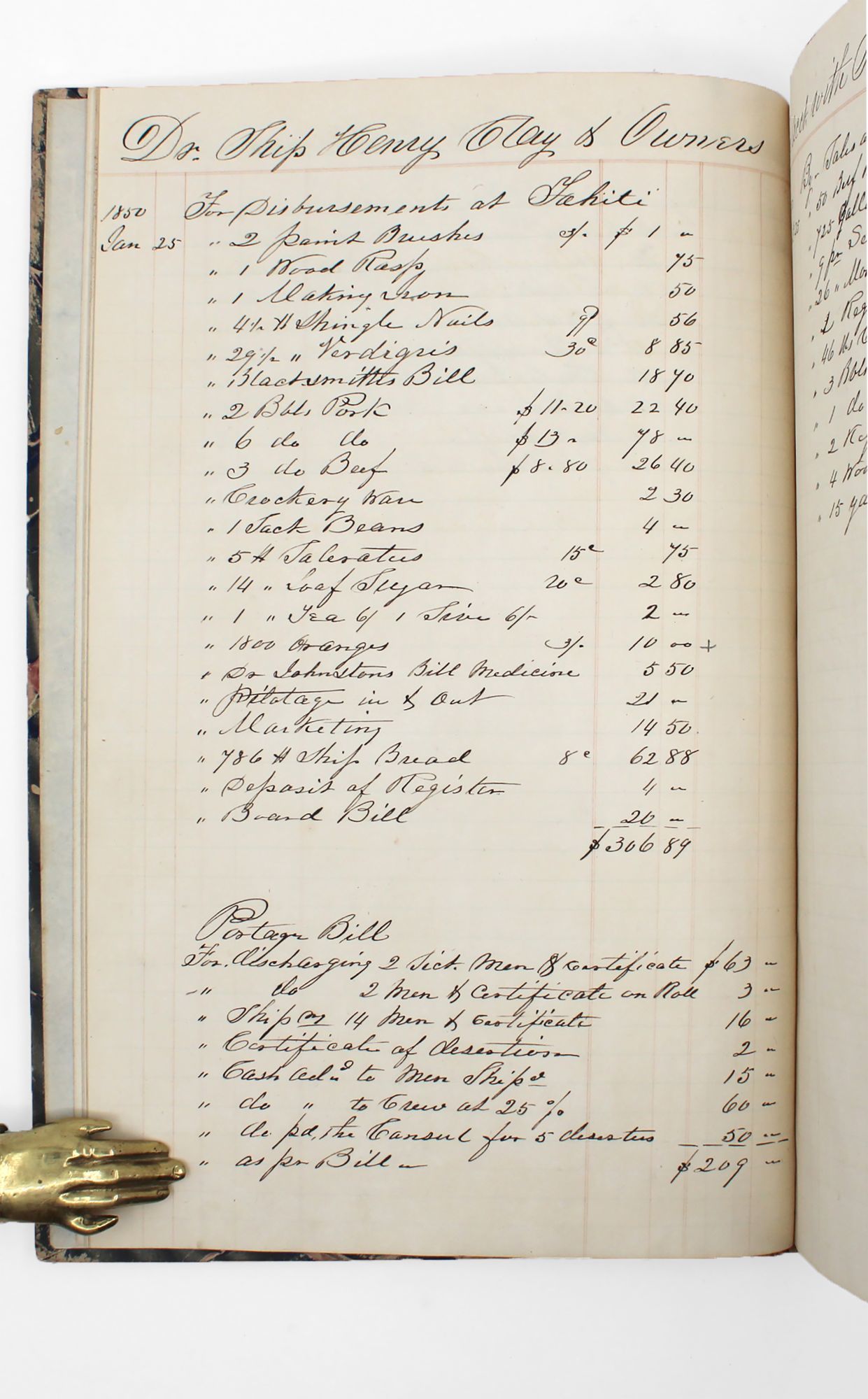 Various places, 1852. 24 pages on lined paper, in ink in legible hand. 4to. Half buff-patterned calf and marbled boards. Several pages removed, wear to head of spine. 24 pages on lined paper, in ink in legible hand. 4to. The manuscript log book of the third and final voyage of the 385-ton whaler Henry Clay out of Nantucket. The voyage began in October 1847, but the first entry in the log is for January 5, 1849, for disbursements at the Marquesas Islands (several leaves are removed from the front, and in a few other places following). Other disbursments and sales are recorded at Paita, Tahiti, Pitcairn Island, Tumbes, Talcahuano, and Rio de Janeiro, where she was condemned on the homeward-bound leg. Records for supplies bought and sold include coconuts, pineapples, breadfruit, hogs, tobacco, muskets, flints, gunpowder, soap, cloth, whale oil, etc. Desertions are recorded on August 8, 1849 at Paita, and January 25, 1850 at Tahiti. The balance sheet for the entire voyage, signed at the end by Captain Skinner, shows $515.16 and a half cents owed the captain, and $1,626.30 in sales of oil.