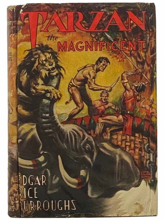 Tarzana: Edgar Rice Burroughs, Inc, 1939. Reissue. Hard Cover. Good/Good. 0x0x0. Burroughs, John Coleman. 1948 printing (Heins TaM-2). Jacket edges and flaps wrinkled, with adhesive residue on edges of reverse, ink name stamp on front endpaper, small sticker on rear endpaper. 1939 Hard Cover. 318 pp. Grey cloth, blue titles. Jacket art and black-and-white frontispiece by John Coleman Burroughs. "Two tribes of frightful warrior women, the Kaji and the Zuli, war with one another for possession of the men they lure into slavery. Their mysterious hypnotic power comes for the magnificent gems they worship -- an emerald and a diamond, each as big as a human head. Will the Lord of the Jungle be immune to the strange power of the Kaji and the Zuli