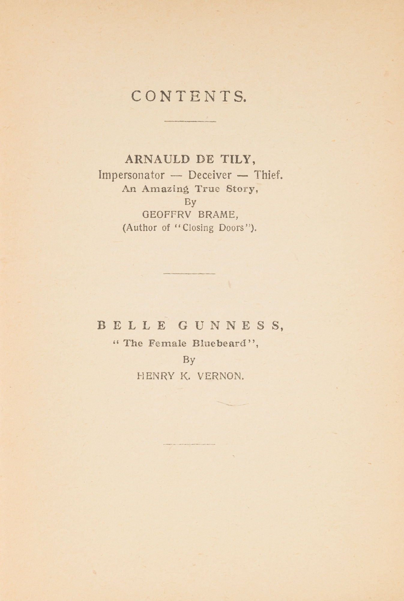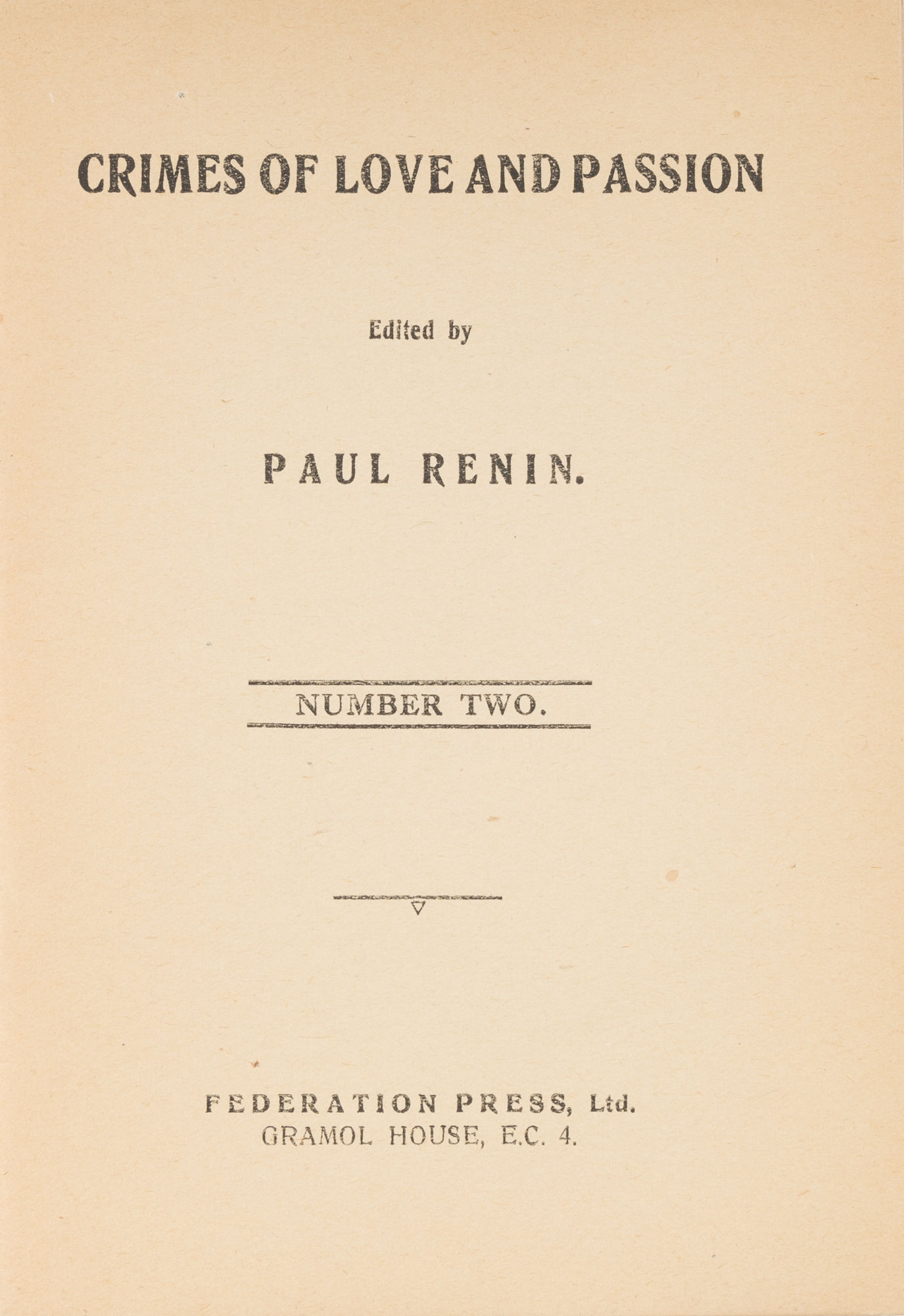 1928. [London]: Federation Press, Ltd., 1928.. [London]: Federation Press, Ltd., 1928. "Crimes of Love and Passion" Brame, Geoffrey. Renin, Paul, Editor. [du Tilh, Arnaud (d.1560)]. [Gunness, Belle (1859-1908?)]. Crimes of Love and Passion, No. 2: The Crimes of Belle Gunness, Murderess, Adultress, And Baby Farmer. A Wife as Prey: The True Story of the Notorious Arnauld de Tily Who Impersonated His Soldier Friend, Deceiving Even His Beautiful Wife [Cover Title]. [London]: Federation Press, Ltd., Gramol House, E.C. 4., c.1928. 31 pp. Stapled pamphlet in color printed wrappers. Light soiling, negligible rubbing to extremities, light browning to interior. A well-preserved copy of a rare title. $950. * This is a title in the true crime series Crimes of Love and Passion. Originally issued around 1928 (the issues are not dated) and re-issued in the 1950s, this series had four volumes. Issue No. 2 has two parts: "Arnauld de Tily, Impersonator-Deceiver-Thief. An Amazing True Story" by Geoffrey Brame and "Belle Gunness, 'The Female Bluebeard'" by Henry K. Vernon. In 1556, a man claiming to be the long-absent French peasant Martin Guerre resurfaced. He successfully convinced Guerre's wife and son of his identity, but when he tried to claim the inheritance left by Guerre's deceased father, other family members grew suspicious. Finally, the real Martin Guerre returned during legal proceedings against the imposter, whose identity was revealed as Arnaud du Tilh. He was hanged in 1560. Gunness was a prolific Norwegian American serial killer who operated in Illinois and Indiana between 1884 and 1908. She is credited with at least fourteen and as many as forty murders; most of her victims were men lured to her Indiana home by personal advertisements she placed. She is alleged to have killed two of her husbands and three infant children in order to collect insurance money. Her crimes were discovered in 1908 when her farmhouse burned to the ground, leaving the remains of a headless woman and three children inside and at least eleven sets of partial remains elsewhere on the property. The woman was presumed to be Gunness, but the identity of the body was never confirmed. OCLC locates 2 copies, both re-issues (Kent State University, University of Arizona).