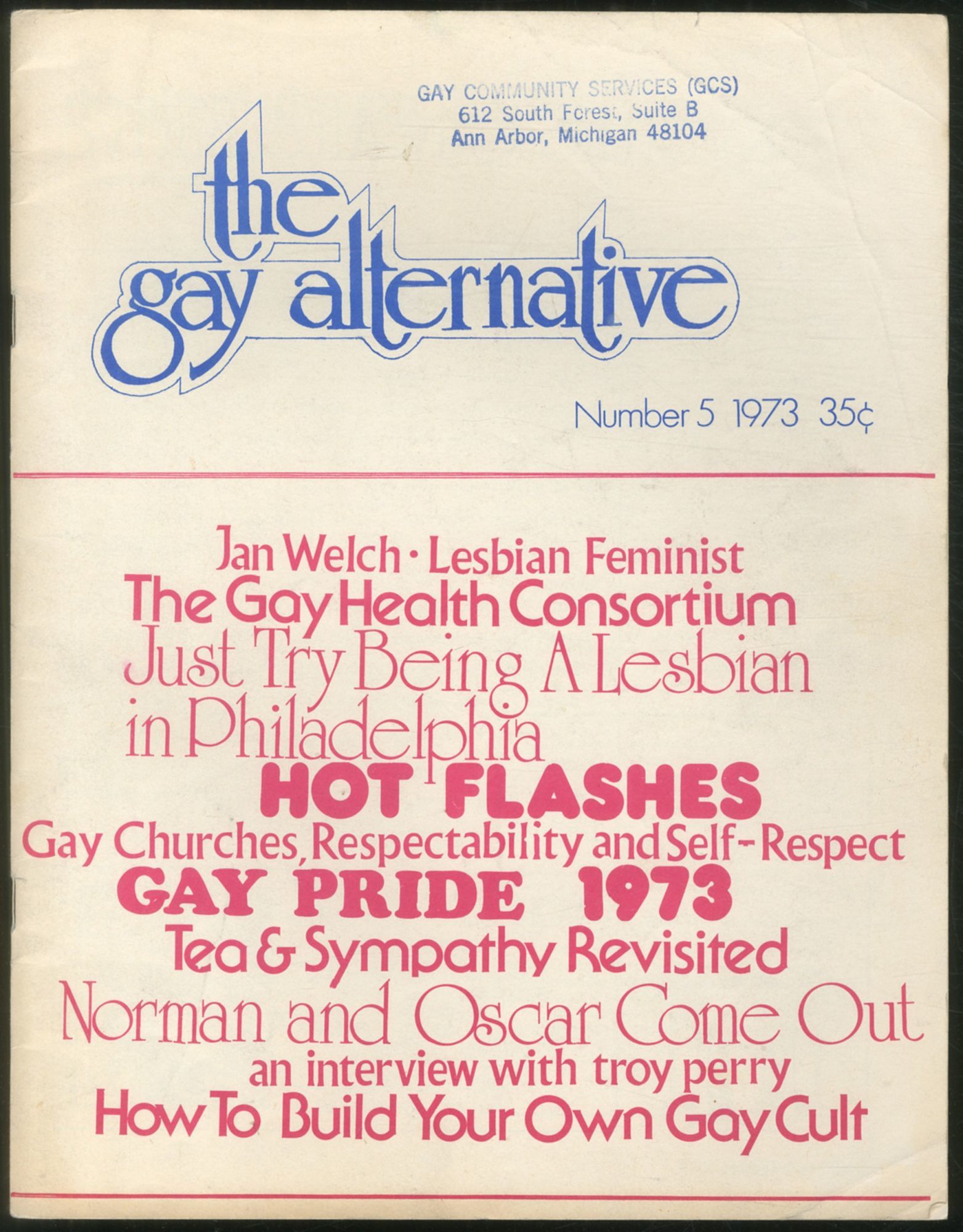 Philadelphia: The Gay Alternative, 1973. Softcover. Very Good. Magazine. Quarto. 35pp. Stapled wrappers. Very good with address stamp on front wrap and creasing at the edges and some interior pages. *The Gay Alternative* was a literary magazine published in Philadelphia from 1972-1976, which began as a newsletter of the Gay Activists Alliance of Philadelphia. This early issue includes a recap of the 1973 Philadelphia Gay Pride Day, an article about feminist activist Jan Welch, an interview with pro-gay Metropolitan Community Church founder Troy Perry, an announcement of the opening of Giovanni's Room bookstore (now the longest continuously owned gay bookstore in American), and an article about being a lesbian in Philadelphia.