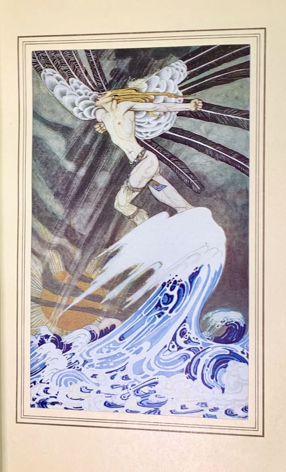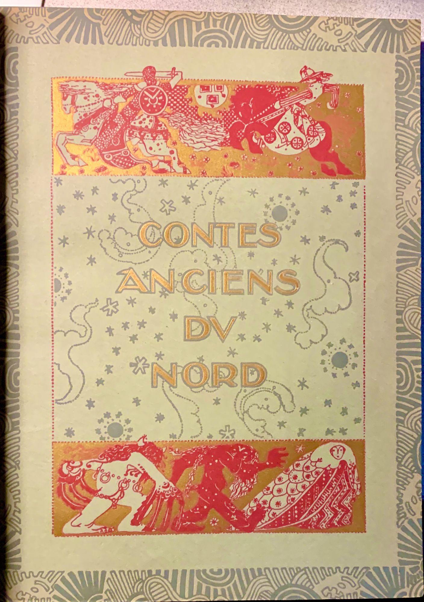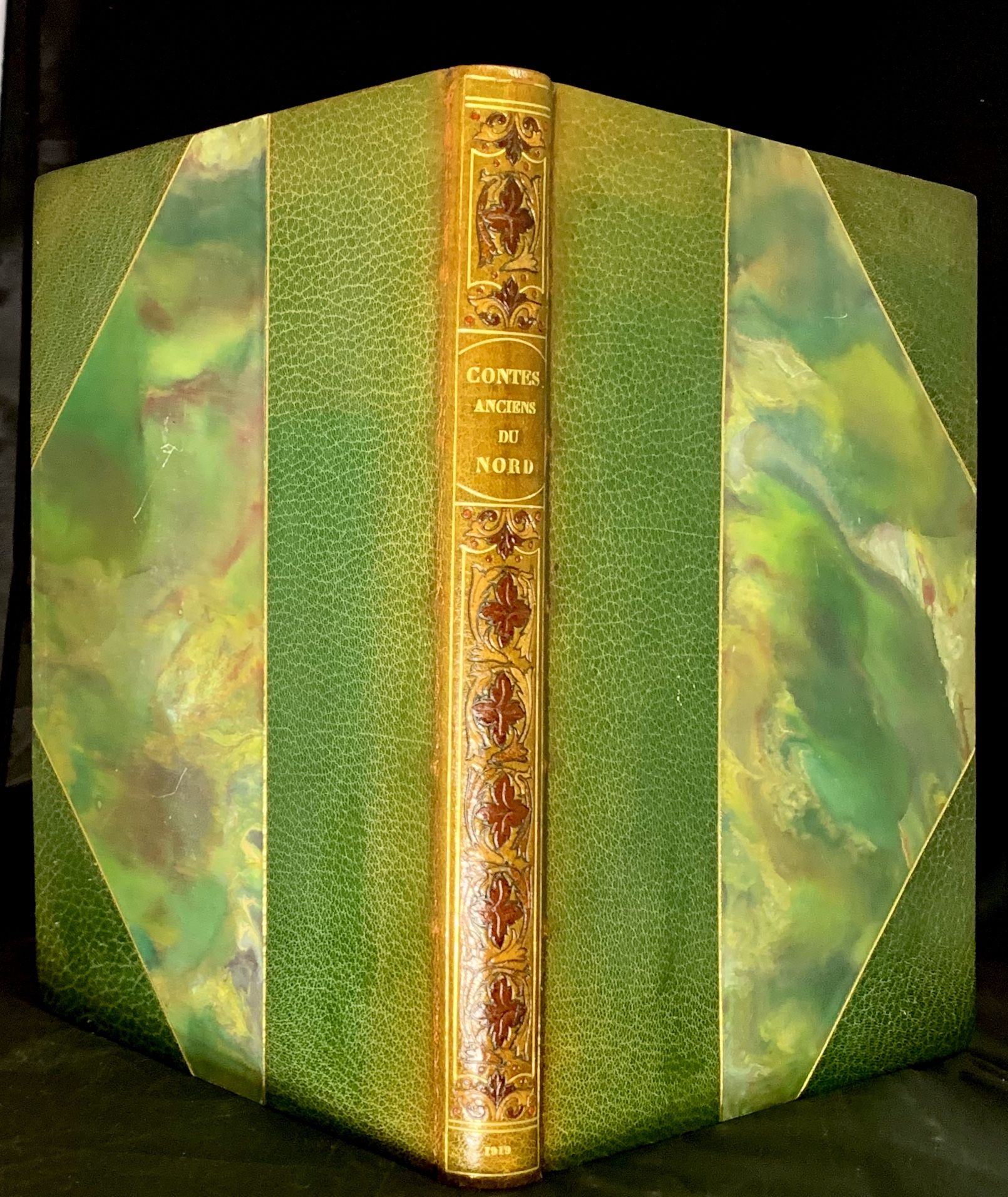 Paris: H. Piazza, 1919. Hardcover. Three quarter green morocco and marbled boards. Teg. Near fine. 125 pages. 29.8 x 22.4 cm. Limited edition, copy 1303 of 1500. Bound by Vermorel, Paris. The English and American editions of East of the Sun and West of the Moon were issued five years earlier. Illustrated with 24 mounted color plates by Nielsen with lettered tissue guards. Title page printed in red and black with original wrappers bound-in. Each page with border design, and additional black and white illustrations in the text. Interior contents clean and fresh. Text in French. Spine faded evenly to brown, decorated in gilt and blind, marbled endpapers.