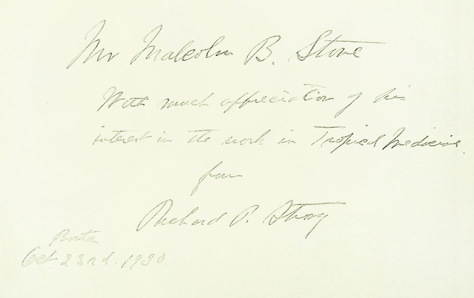 Cambridge: Harvard University Press, 1930. First Edition. Inscribed on front endpaper of first volume: "Mr. Malcolm B. Stone / with much appreciation of his interest in the work in tropical medicine / from Richard P. Strong," dated in year of publication. First printings. Two large octavo volumes (27cm); publisher's maroon cloth boards, lettered in gilt on spines and front covers; xxvi,[1]-568; ix,569-1064pp; illus. Mild lean to text block of second volume, else a tight, Near Fine set, lacking the dustwrappers. A major work in the history of public medicine. Strong (1872-1948) was the first professor of Tropical Medicine at Harvard, and the foremost American authority on the subject. This important two-year expedition to Liberia and the Congo, led by Strong in the company of seven fellow Harvard scientists, was the first full-scale attempt to document the etiology of a variety of tropical diseases as well as documenting existing sanitary conditions in Liberia and colonial West Africa. The mission also collected a wealth of zoological and anthropological data that would inform various fields of Africa Studies for decades.