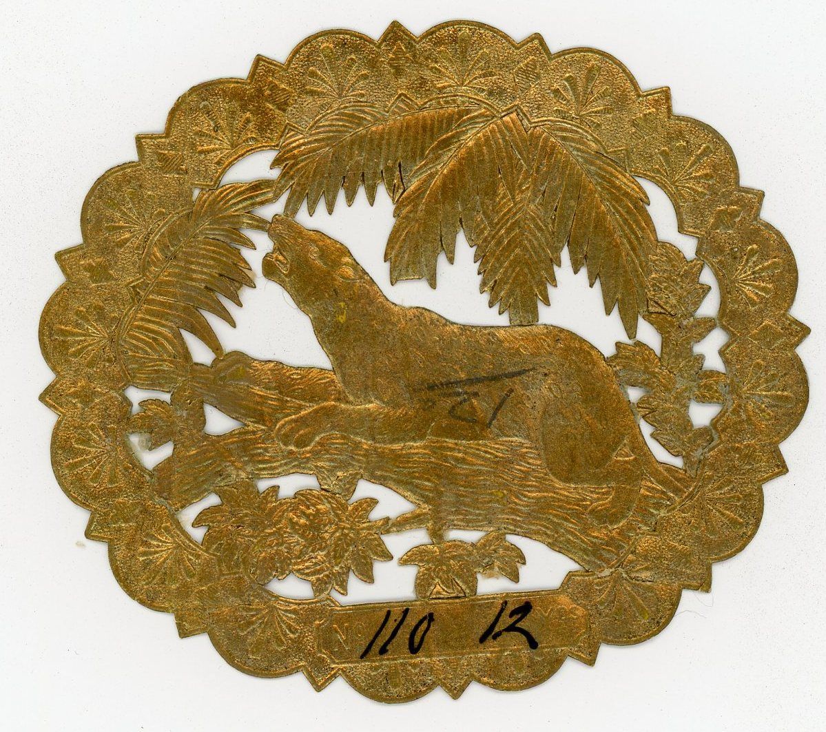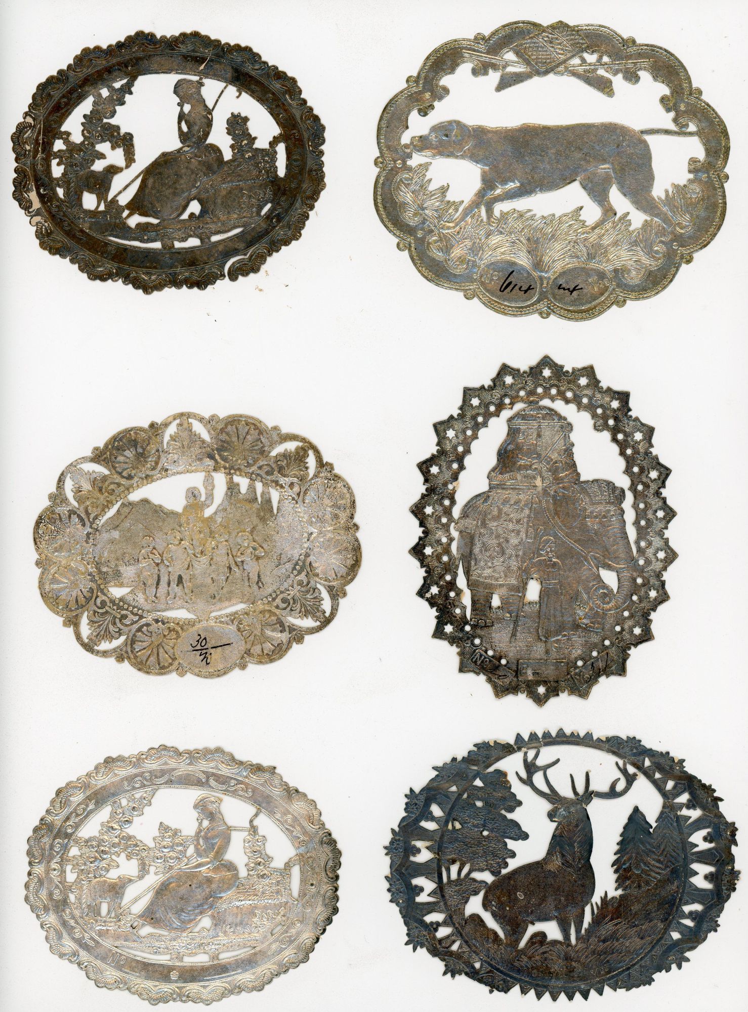 embossed die-cut silvered 3 1/4" x 4" labels with elaborate border decoration and mostly animals or women as the central image. No indication of product or manufacturer.