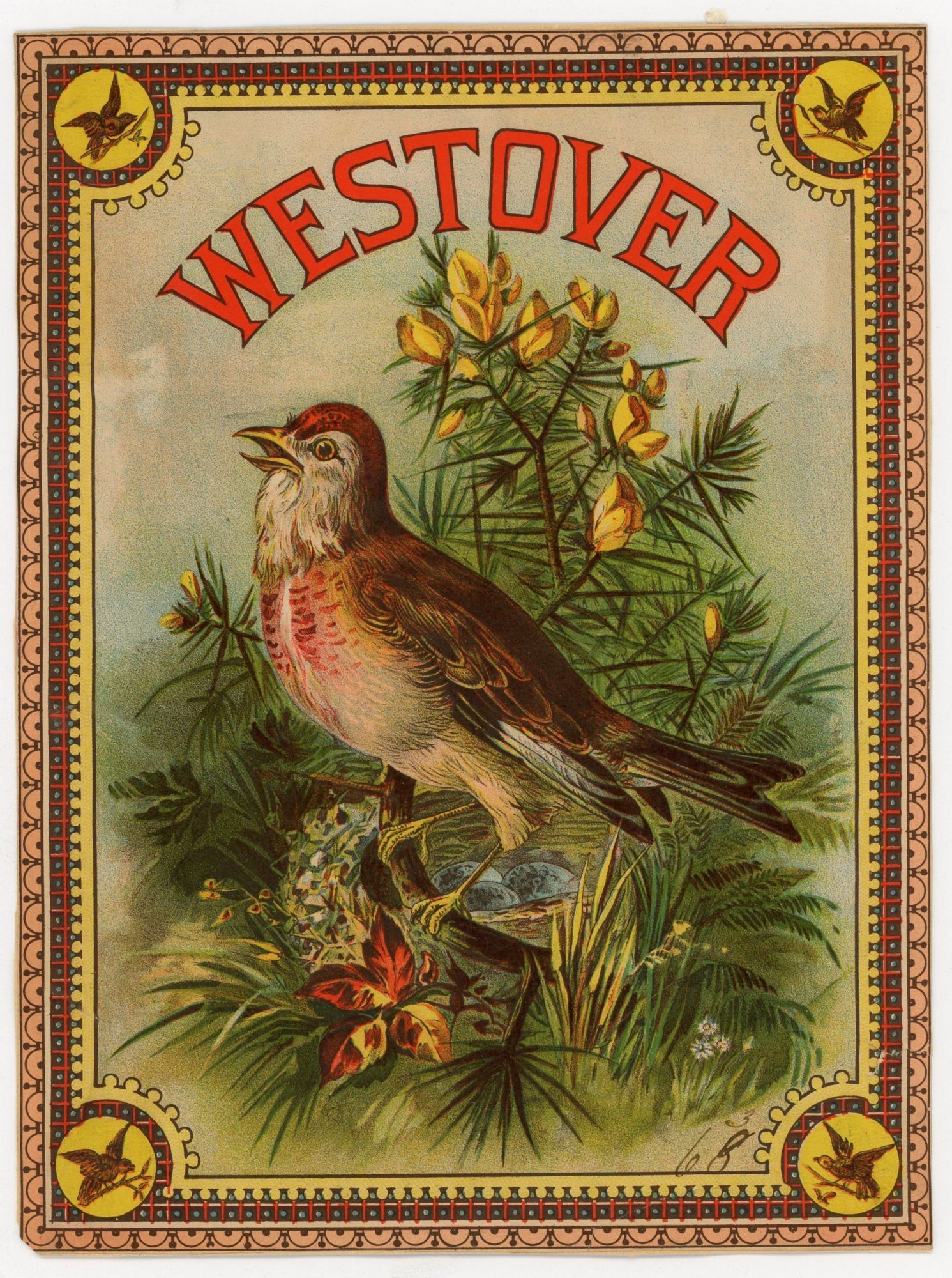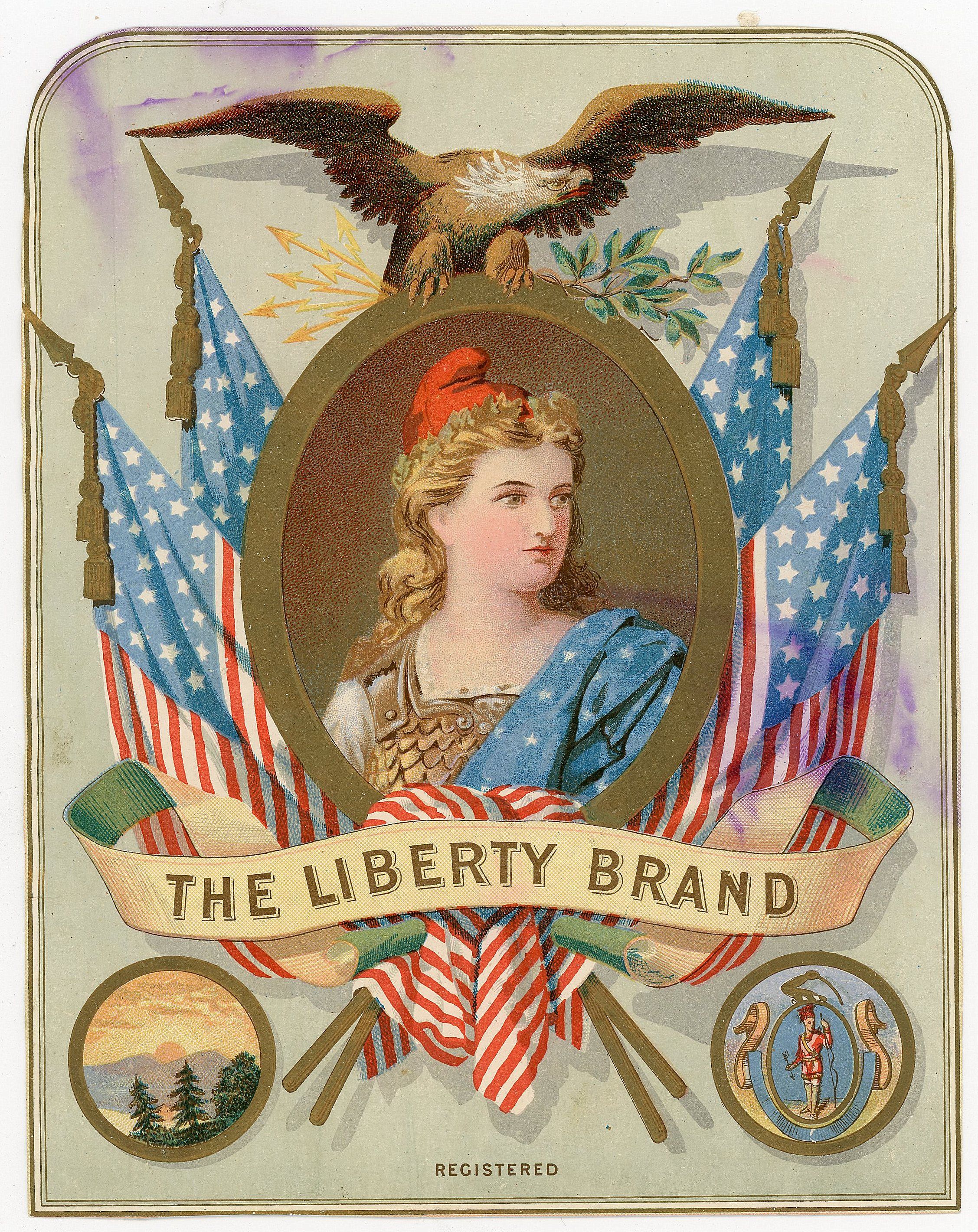 Simple border with very large central image often drawn from popular culture, history or patriotism amidst relative items relative to the central image, but unrelated to the named product. 8" x 9 1/2" or larger. This category includes an even larger label that includes a map of the United States and a backdrop of flags.