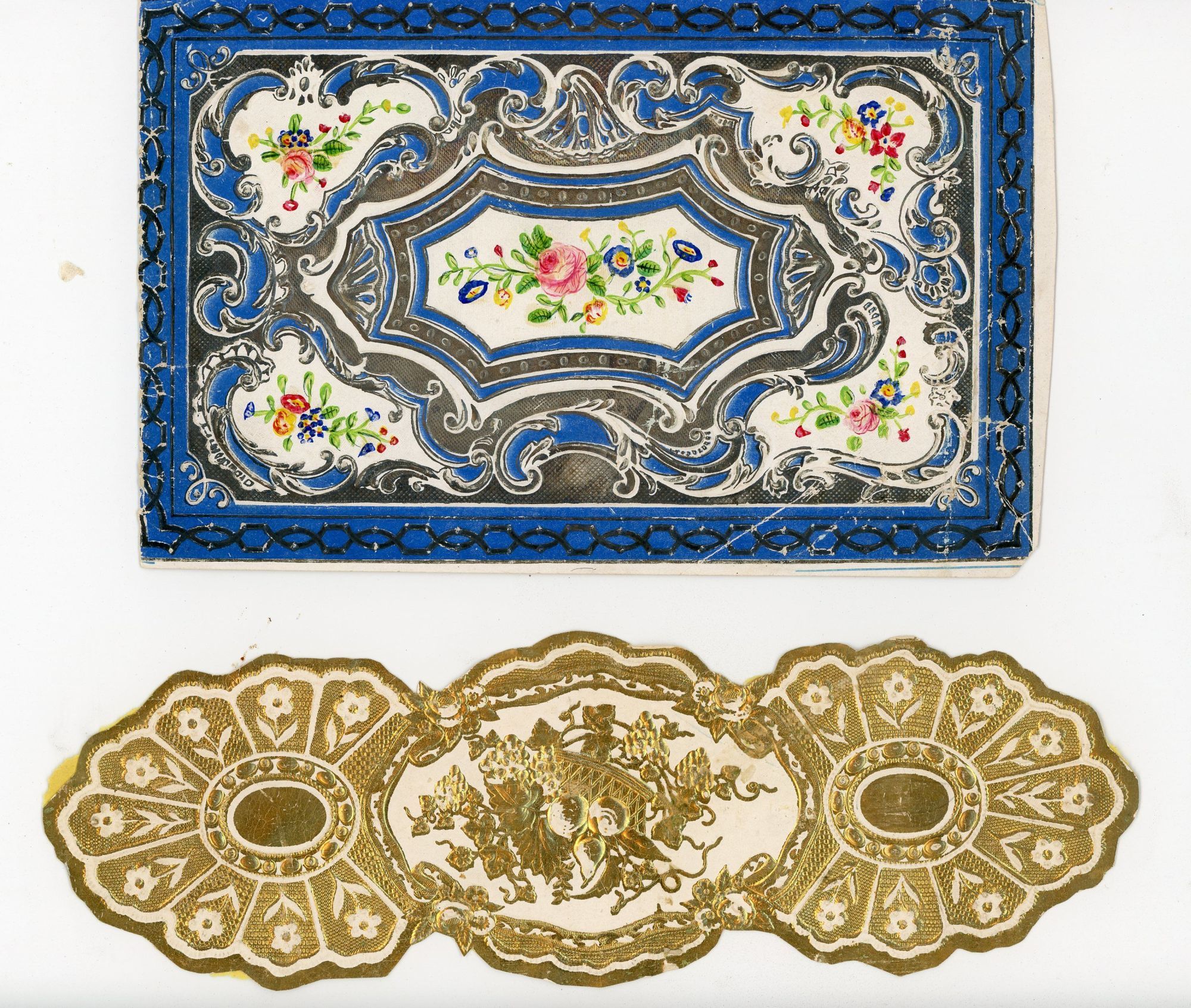 Solid coated stock with embossed decorative borders surrounding a central image. Some include areas to write numbers and quantities. Usually rectangle, but some die-cut shapes with elaborate design