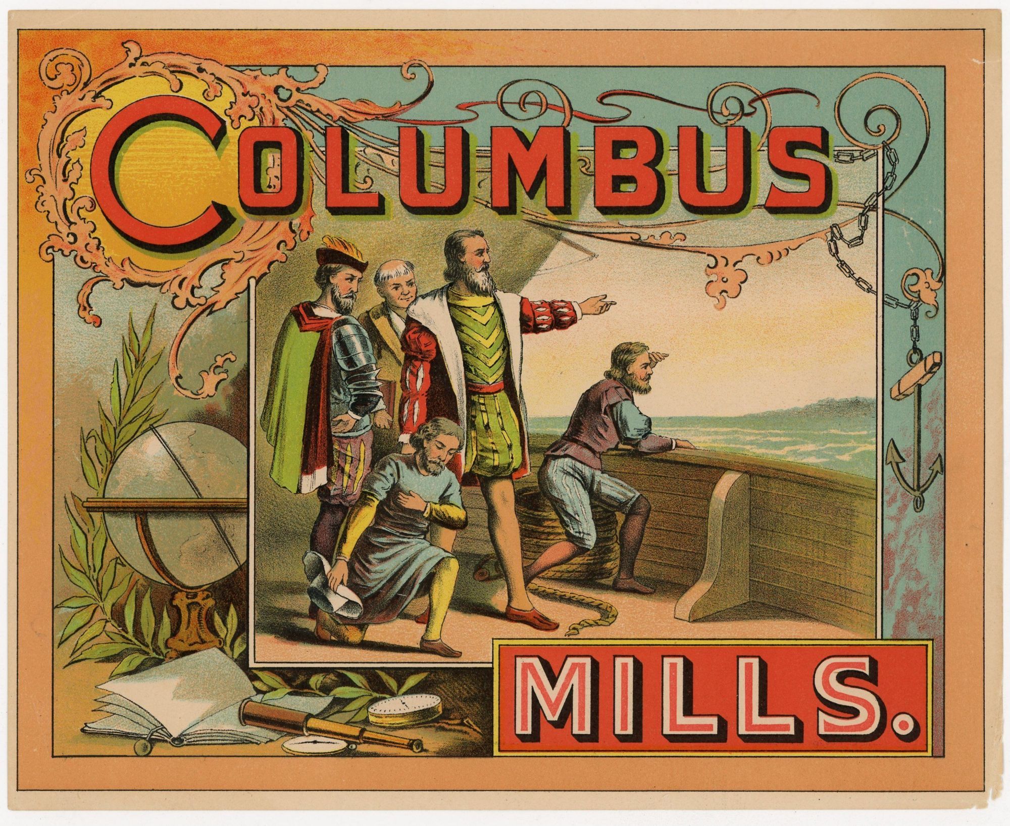 Black and white engraving with relevant product imagery and name. Often imagery of exterior of mills.
