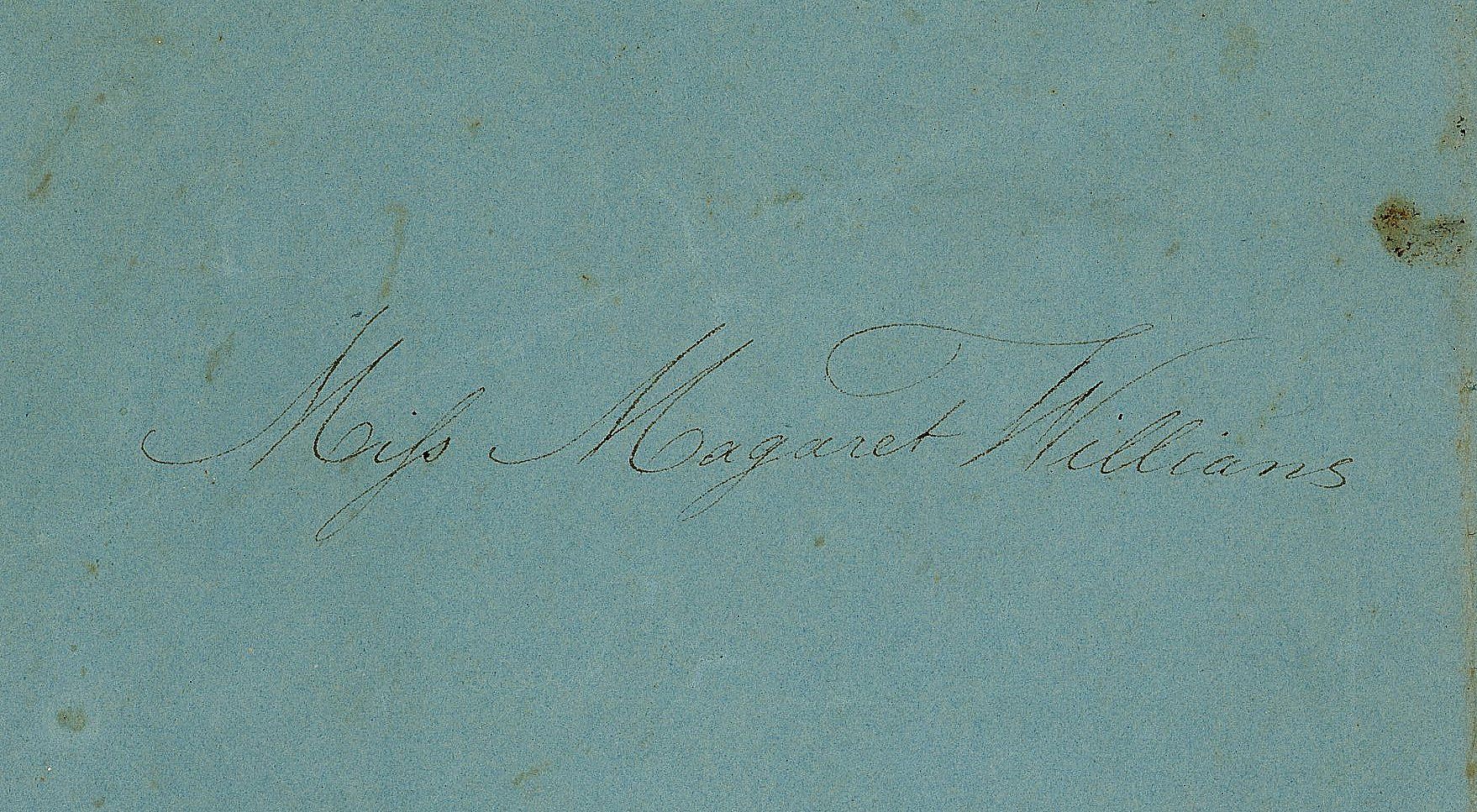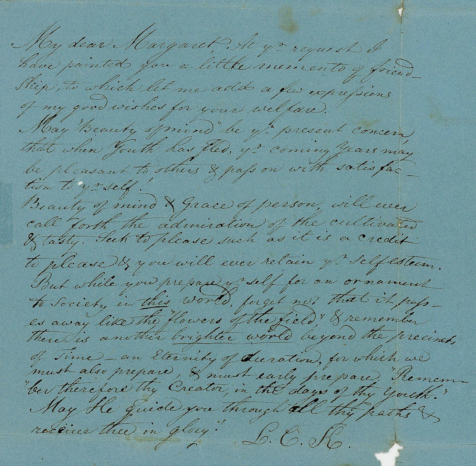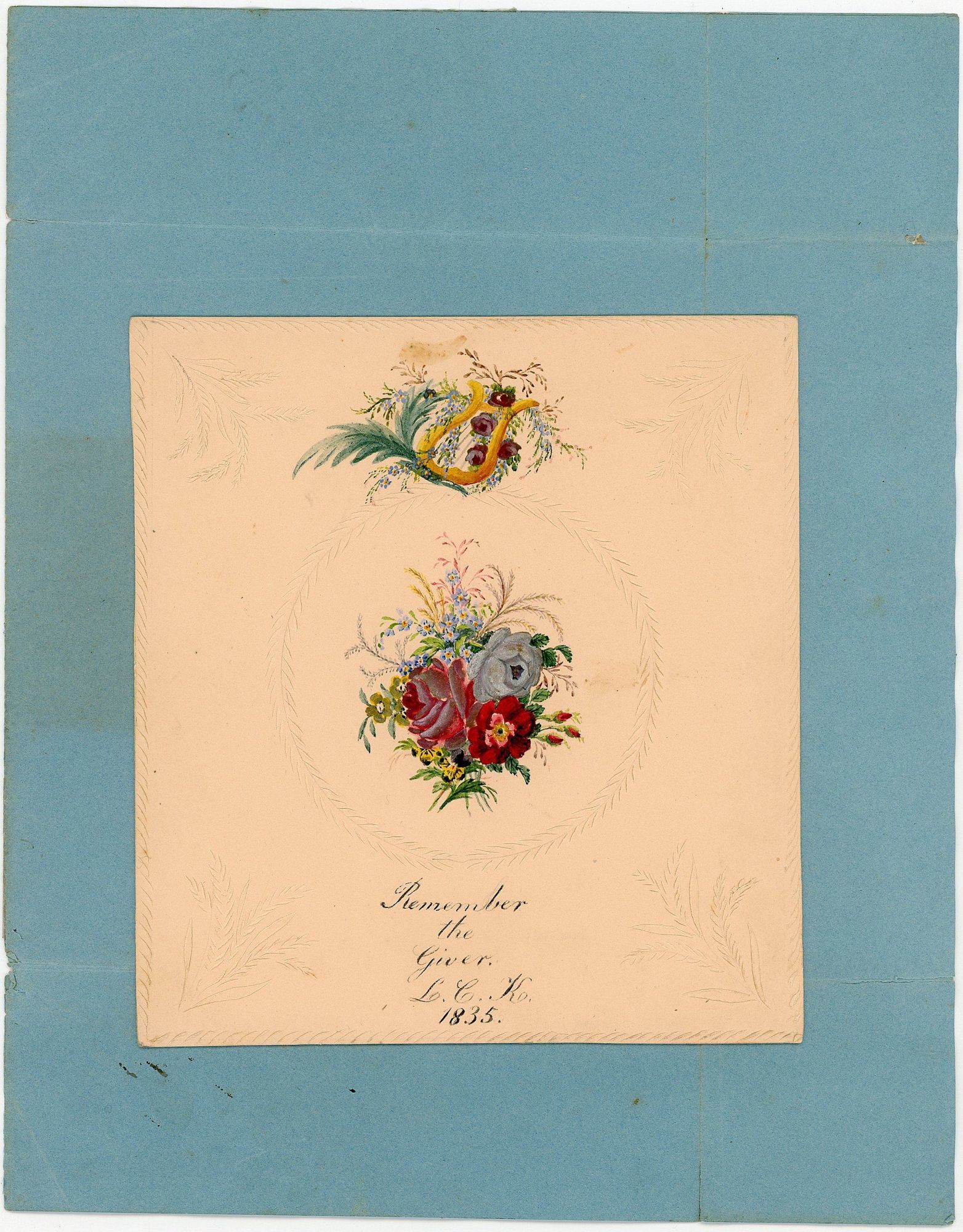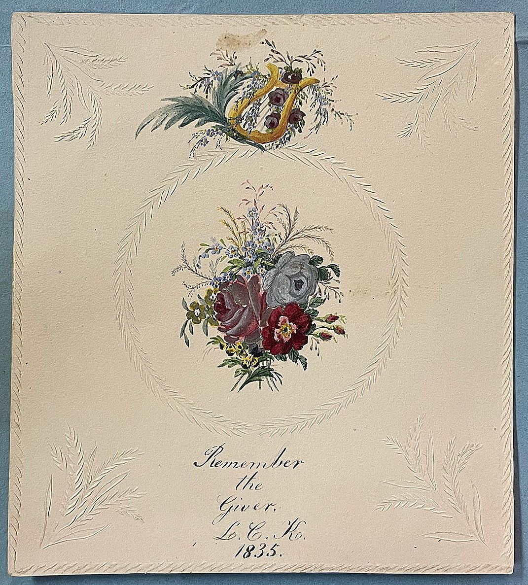 1835. Letter folds. Come separation at folds.. A 6" x 5 1/2" heavy card applied to the front a larger blue lettersheet. The finely decorated card depicts two detailed vignettes - One with a harp, violets, forget-me-nots and fern, the other an array of roses, pansies, forget-me-nots and more. The rose array is at the center razor cut laurel wreath with razor cut border decorations depicting sprays of grass or grain with a hashed razor design surrounding the entire border. The letter within is to dear Margaret who had requested the sender to paint a memento of friendship followed by lovely thoughts on the Beauty of mind and grace of a person. Addressed to Miss Margaret Williams on reverse. Letter sheet measures 10" x 8". Cutwork measures 6" x 5 1/2" The cutwork was most likely affixed to the letter at a later date to keep the two pieces together subsequent to Margaret completing the work.