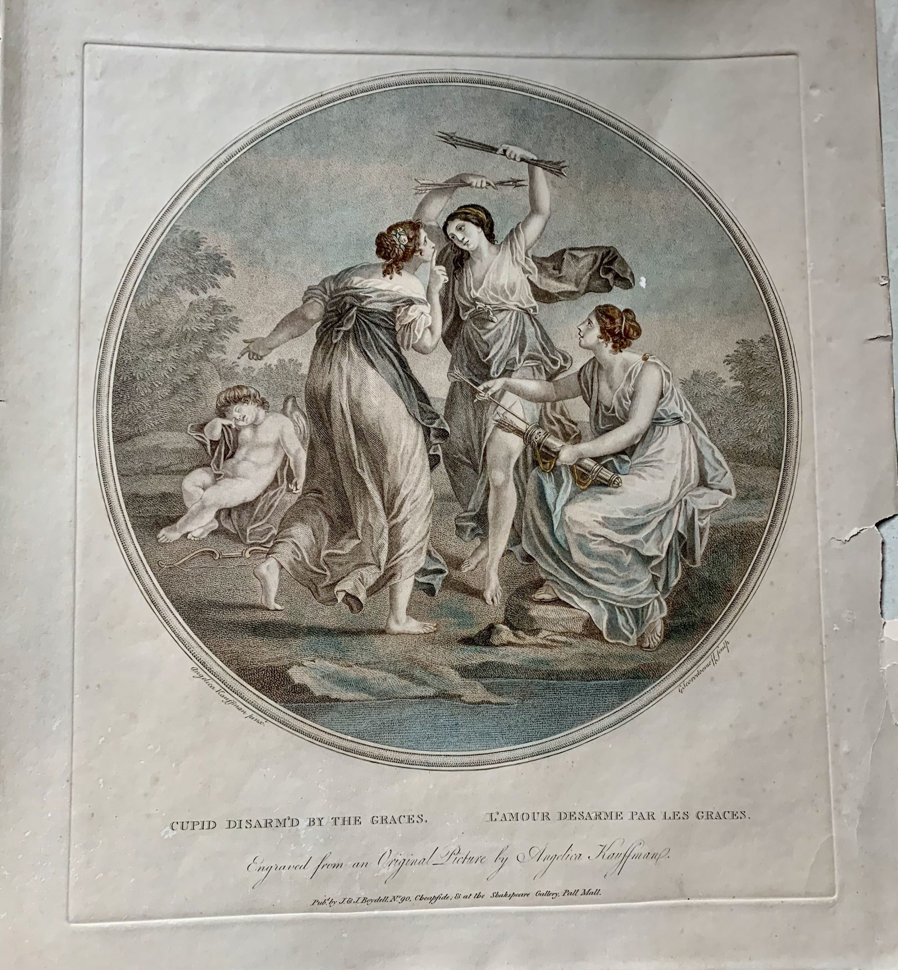 London: J & T Boydell, Nd. Stiff Wraps. Very good. Kauffman, Angelica. Sepia stipple engraved on wove paper, plate 35.5 x 30 cm., total margin 41 x 35 cm. Sir Joshua Reynolds was one of her staunchest allies. As a woman and history painter, an unusual designation for a woman artist in the 18th century considering history painting was the elite and most lucrative category dominated by men. The genre required extensive learning in biblical and classical literature, a background in which most women were denied access. Engraved by G. Scorodoomo. Lacks one centimeter at right margin, lower middle. Clean, bright image.