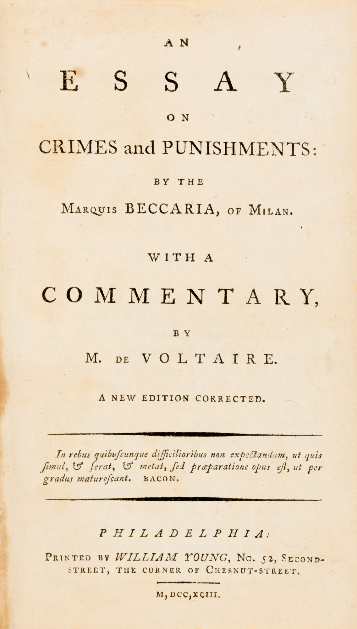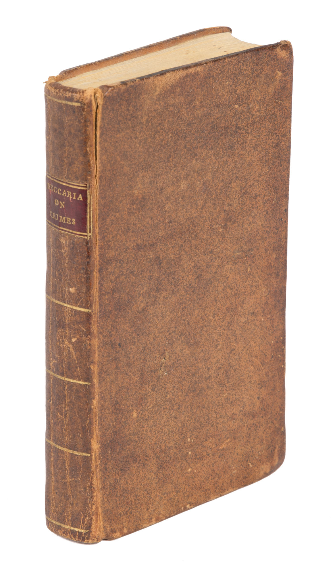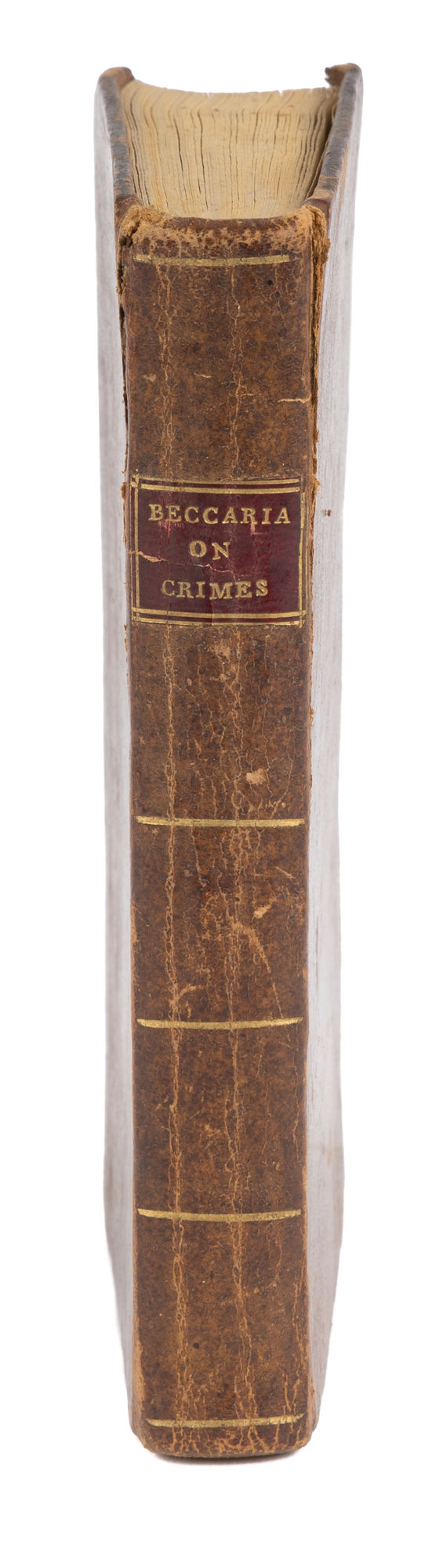 1793. Philadelphia, 1793. 3rd American Edition. Philadelphia, 1793. 3rd American Edition. Early American Edition of "One of the Most Influential Books in the Whole History of Criminology," PMM 209 Beccaria, [Cesare Bonesana, Marchese di] [1738-1794]. Voltaire (Arouet, Francois-Marie) [1694-1778]. An Essay on Crimes and Punishments: By the Marquis Beccaria, Of Milan. With a Commentary by M. De Voltaire. A New Edition Corrected. Philadelphia: Printed by William Young, 1793. x, [13]-230 pp. 12mo. (6" x 3-1/2"). Contemporary sheep, lettering piece and gilt fillets to spine. Light rubbing and some minor nicks to boards, a few creases to spine, joints starting at head, moderate rubbing to spine ends and corners, which are lightly bumped, front free endpaper lacking. Light toning to text, light foxing and negligible faint stains to a few leaves, early repair to Leaf D6 (pp. 43-44) with no loss to text. An attractive copy. $750. * Third American edition. First published in Livorno in 1764 as Dei Delitti e Delle Pene, this landmark work is, to quote Printing and the Mind of Man, "one of the most influential books in the whole history of criminology. It is significant because it was the first systematic study of the subject. Infused with the spirit of the Enlightenment, its advocacy of crime prevention and the abolition of torture and capital punishment marked a significant advance in criminological thought, which had changed little since the Middle Ages. It had a profound influence on the development of criminal law. It was especially influential among American thinkers, such as Thomas Jefferson, who wished to use Beccaria to reform the system of criminal law Americans inherited from England. The first two American editions were issued Charleston in 1777 and Philadelphia in 1778. Printing and the Mind of Man 209. Sowerby, Catalogue of the Library of Thomas Jefferson 2349. Cohen, Bibliography of Early American Law 4234.