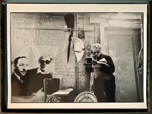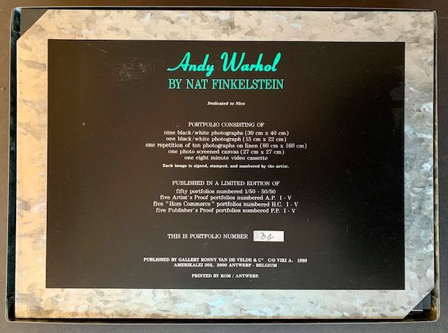 Antwerp, Belgium: Gallery Ronny Van de Velde, 1989. Near Fine. A magnificent --and very uncommon-- portfolio of original photographic prints by Nat Finkelstein (1933-2009), one of the great chroniclers of Andy Warhol, specifically his mid to late 60s period at The Factory. Gallery Ronny Van de Velde of Antwerp produced and published this lavish tribute to Warhol in 1989 in a tiny edition of 50 copies (this being #31). Included in the complete portfolio are: "nine black/white photographs (30 cm x 40 cm)"; "one black/white photograph (15 cm x 22 cm)"; "one repetition of ten photographs on linen (80 cm x 160 cm)"; "one photo screened canvas (27 cm x 27 cm)"; and "one eight minute video cassette". "Each image is signed, stamped, and numbered (31/50) by the artist" and each is mounted to a light-gray cardboard backing, with dark, thin-cardboard guards (which have done their job well and kept each of the prints in pristine condition). The entire portfolio is contained within a marbled, pictorial metal box, with a thin layer of the publisher's light-blue plastic covering the top of the box (which features one of Finkelstein's iconic portraits of Warhol). The blue plastic shows very light bubbling along the center and mild fraying at the upper corners. Otherwise, the box is in all-but-immaculate condition. (In addition, a dense, matching sheet of marbled metal --constituting the title/limitation pages-- is included in the portfolio). One imagines, of the 50 copies issued (in addition to the 5 "Artist's Proof" portfolios, the 5 "Hors Commerce" portfolios and the 5 "Publisher's Proof" portfolios), that very few have survived intact, given the number of prints that have SEPARATELY come onto the market over the years AND the strong urge among the owners of the portfolio to frame the most compelling images. A scarce, desirable Warhol item, especially complete as such.