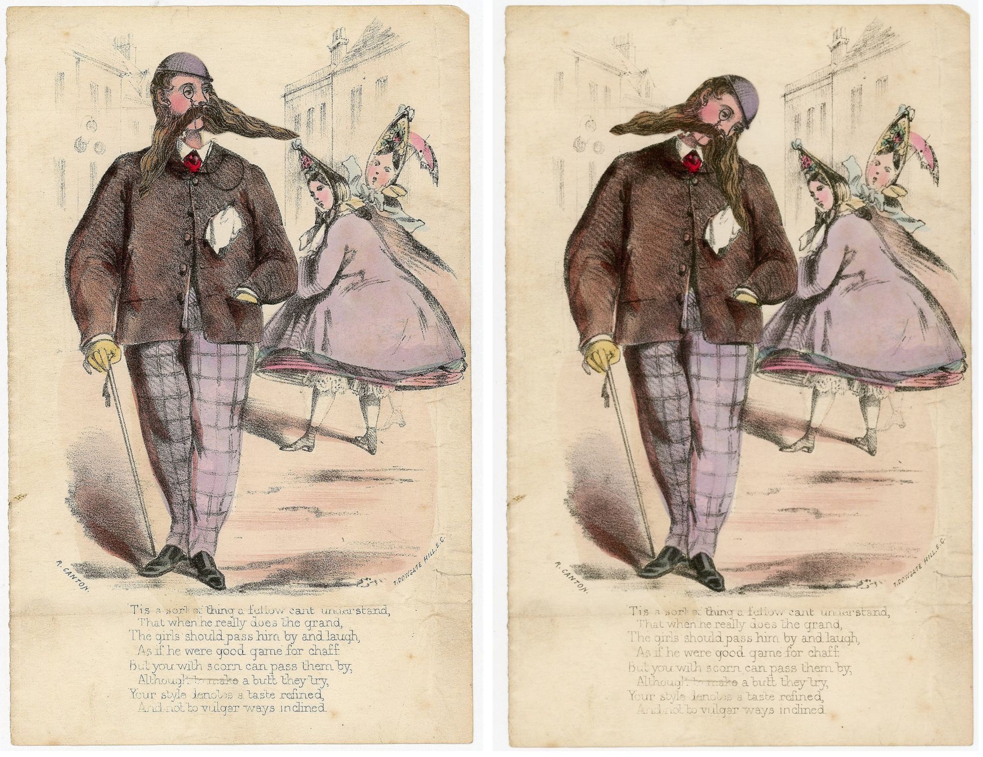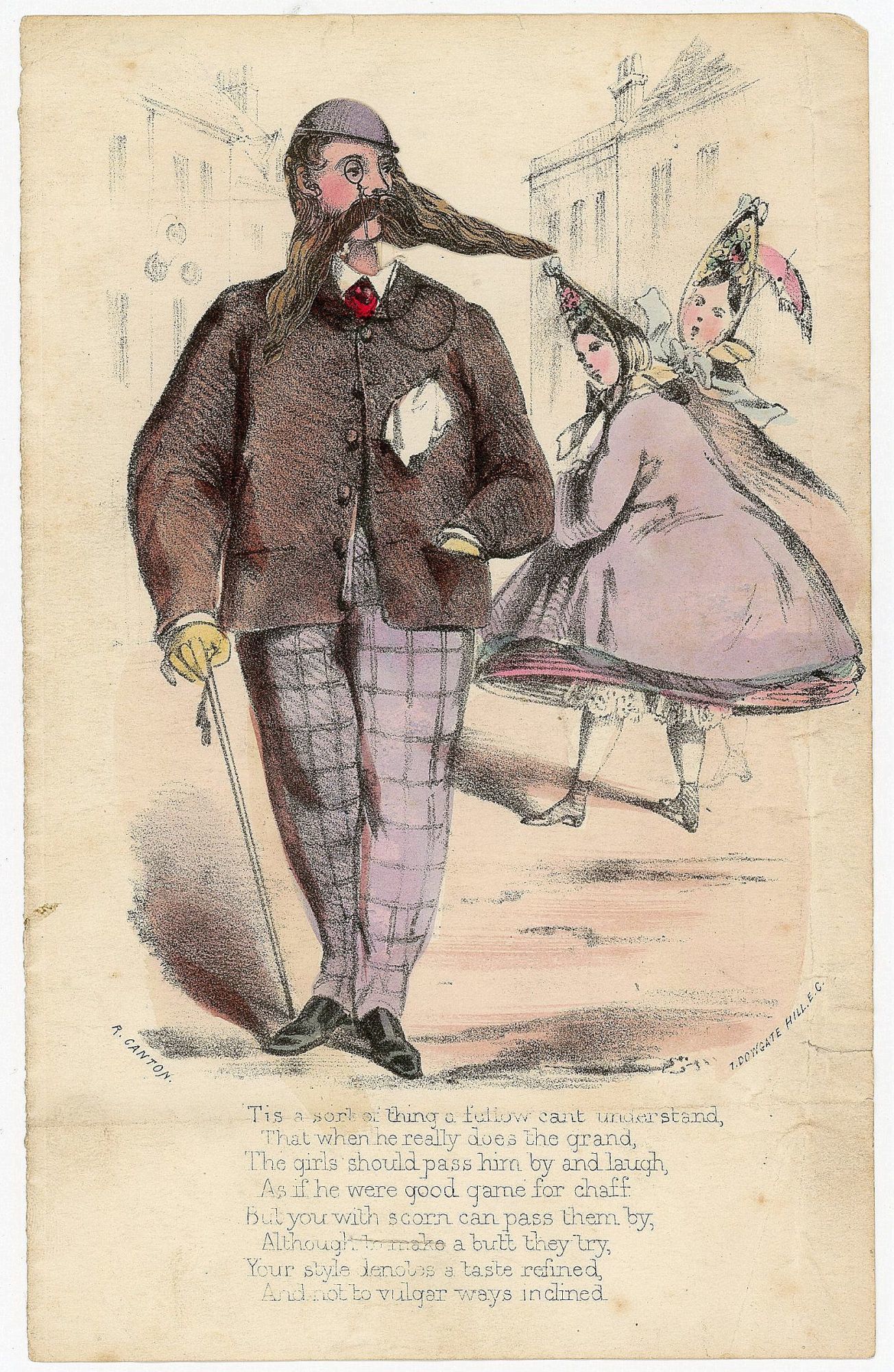 London: R. Canton. Originally single-fold, black second page lacking.. An 8" x 5" hand colored lithograph with women looking askance at a strutting gent. His head and mustache can be moved from side to side with a mechanism on the reverse. It is captioned
