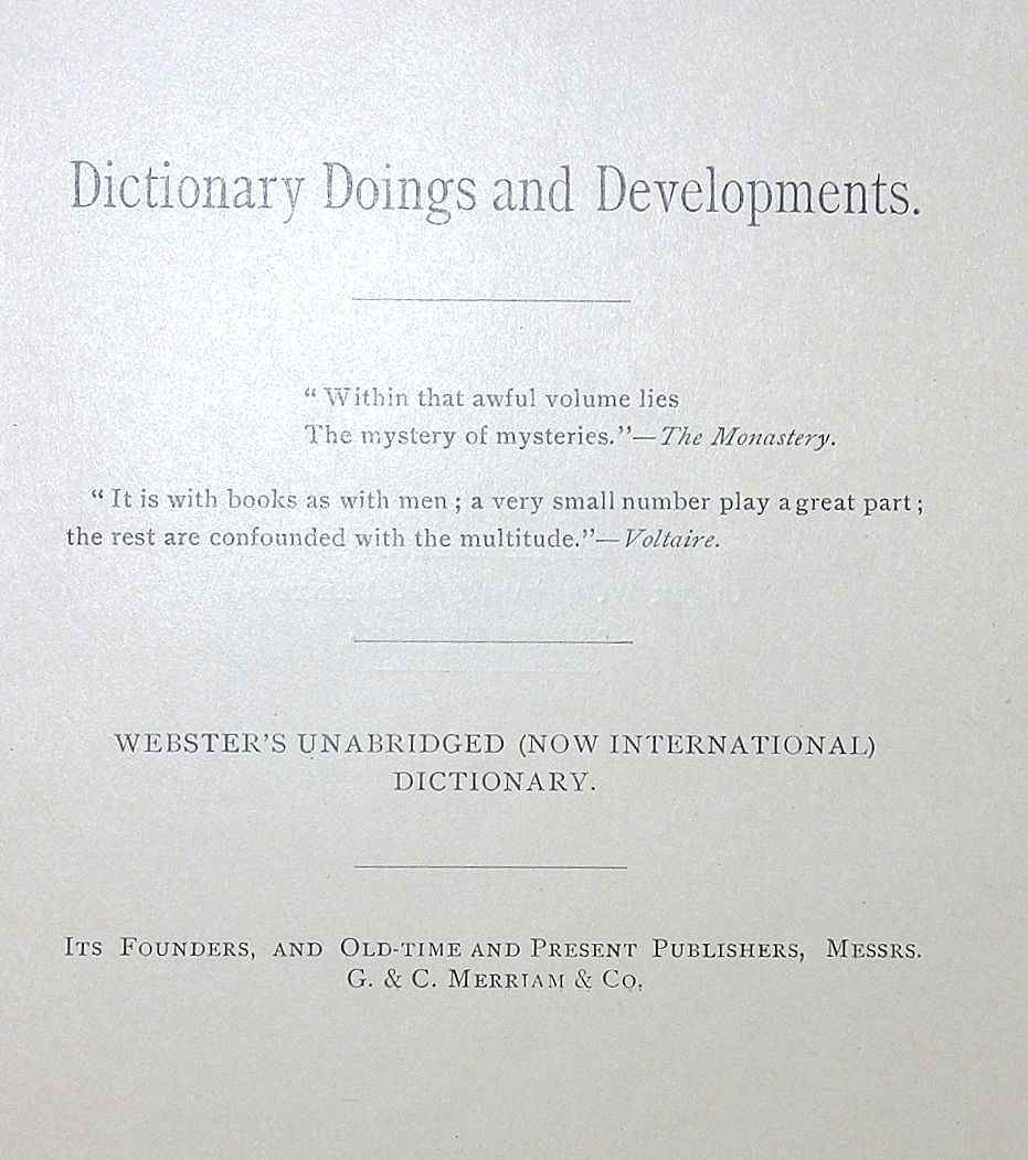 Dictionary Doings and Developments, Webster's Unabridged (Now International) Dictionary. Springfield, MA,Clark W. Bryan & Co. 1890