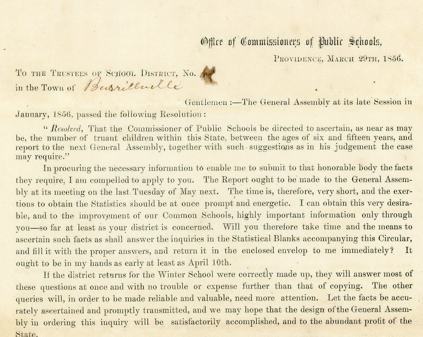 Providence RI, 1856. Two (2) printed letters send from Robert Allyn, Commissioner Public Schools advising that the General Assembly has requested each Town or District to provide information on truancy of children between the ages of 6 and 15 years. The information was to be submitted on Statistical Blanks (not included) within 10 days. One letter was sent to the town of Burrillville. Reverse is blank. Measures 93/4" x 7 1/2