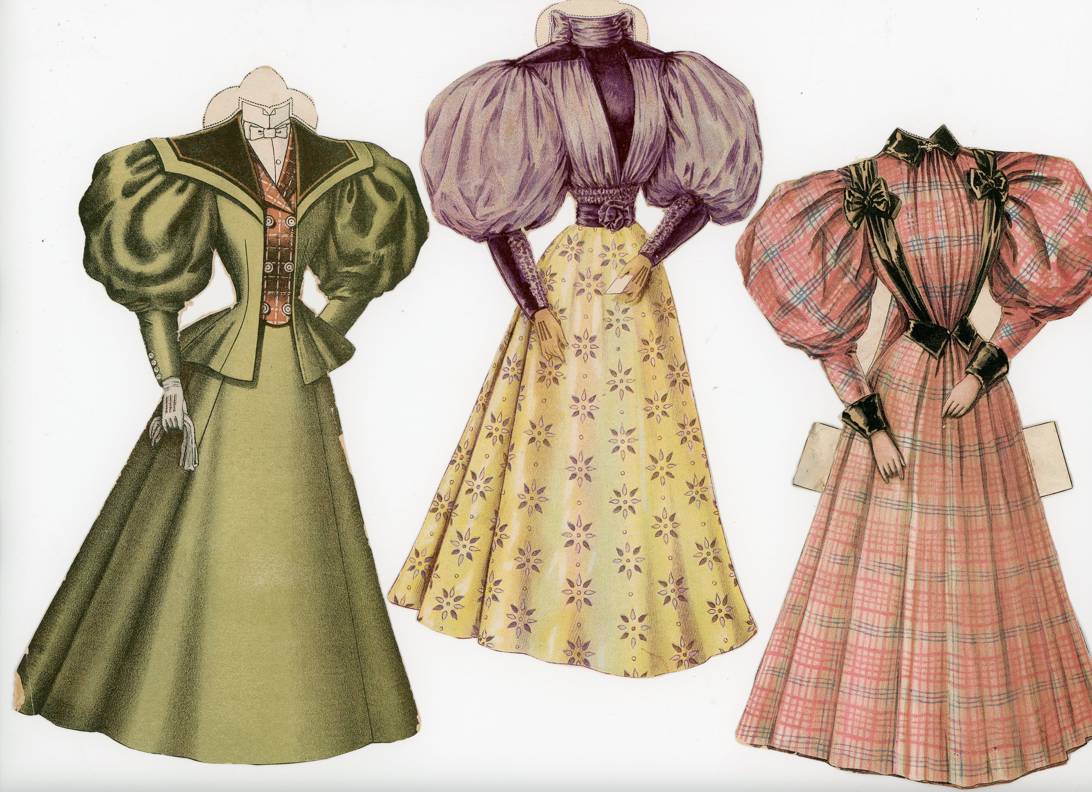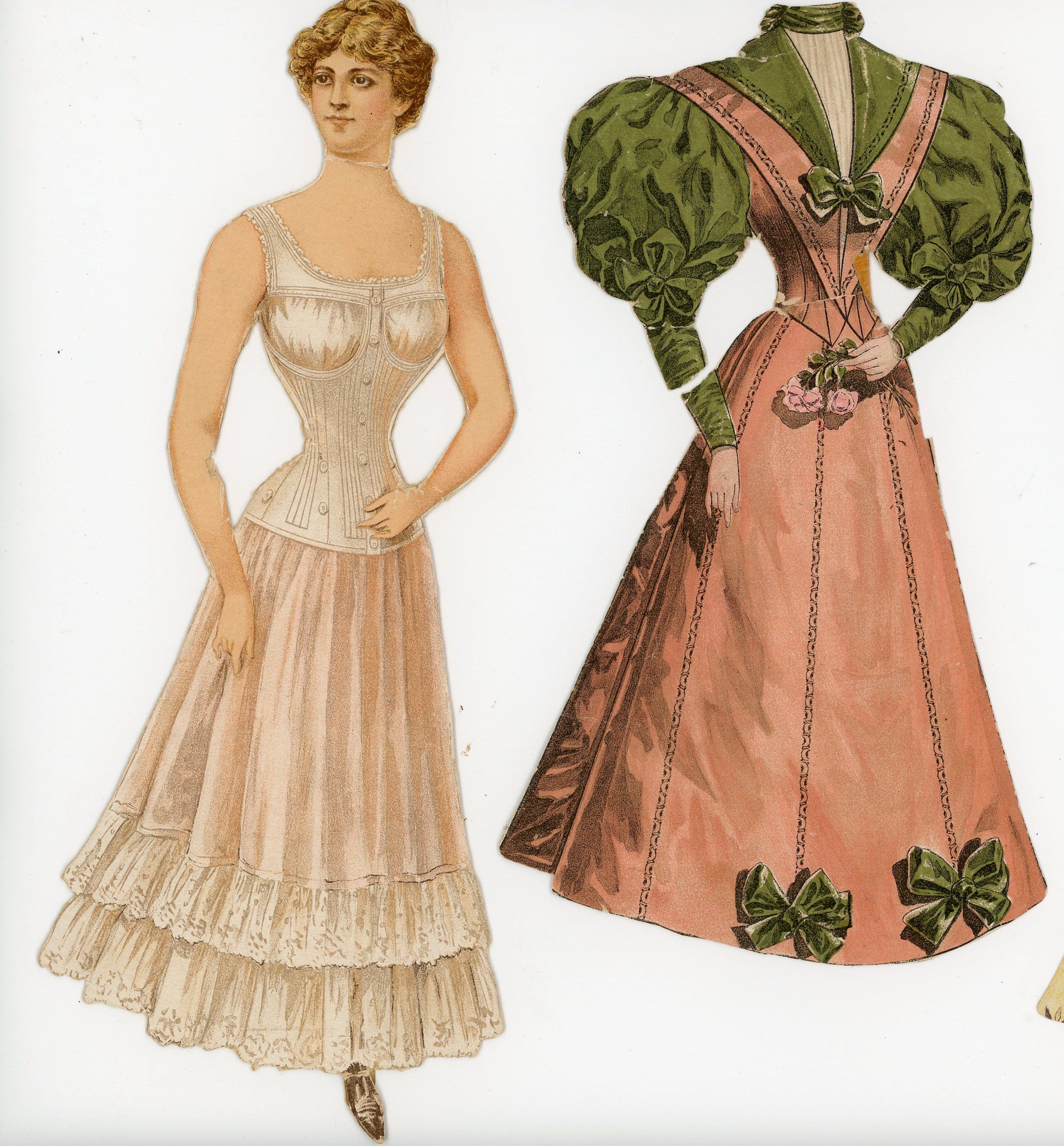 New York: DeMorest, 1895. An 8 3/4" tall paper doll printed on card stock by Demorest as a promotional give away. The costumes were found in the magazines and cut from the pages. Doll lacking foot; neck bend. One dress repaired at waist on reverse (old repair)
