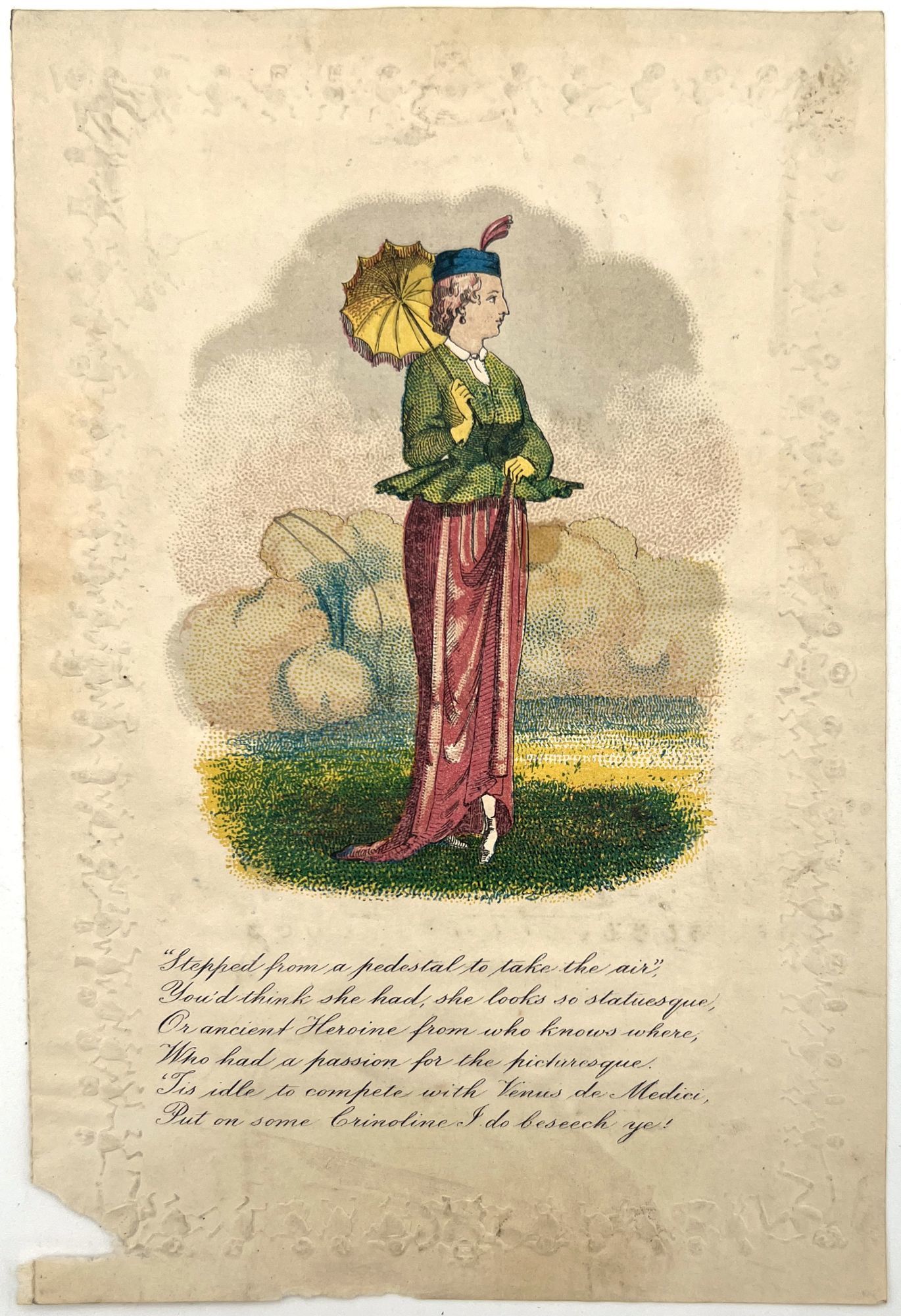 1860. Originally single-fold, black second page lacking. Paper lacking lower left margin.. An 8" x 5 1/4" color lithograph illustration of a statuesque and proper lady borders by embossed whimsical anthropomorphic heart characters surrounding the margins. It is captioned: